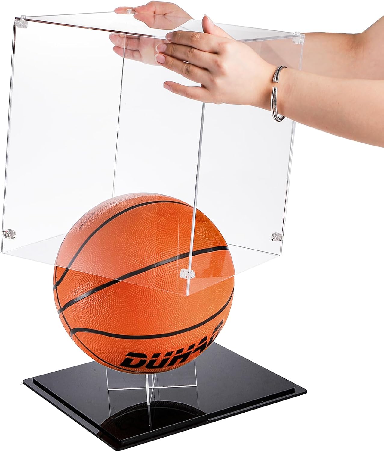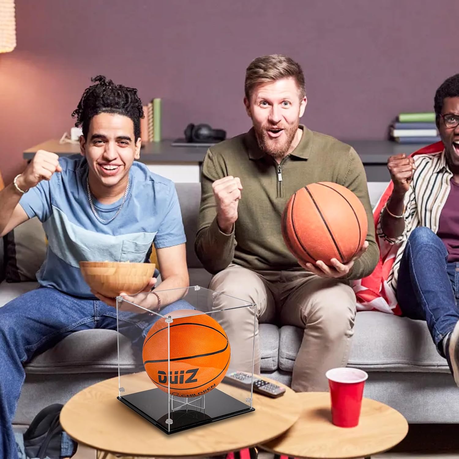 Basketball Display Case, Clear Acrylic Football Holder with Black Stand, UV Protected Soccer Ball Countertop Cube Box for Sport Collectibles, Autographed Souvenirs, Watch The Video to Assemble