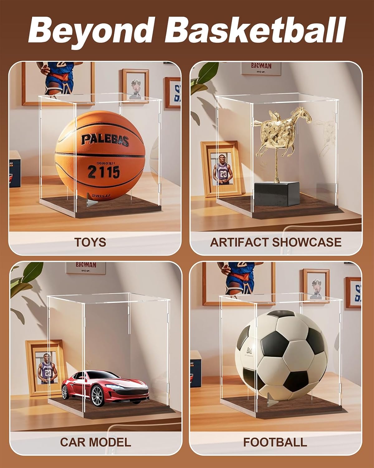 【Display Anywhere with Elegance】Perfect for living rooms, bedrooms, offices, man caves, retail stores, or exhibition shelves, this basketball display stand complements any space. The minimalist acrylic-and-wood design ensures your ball—not the case—remains the star of attention.