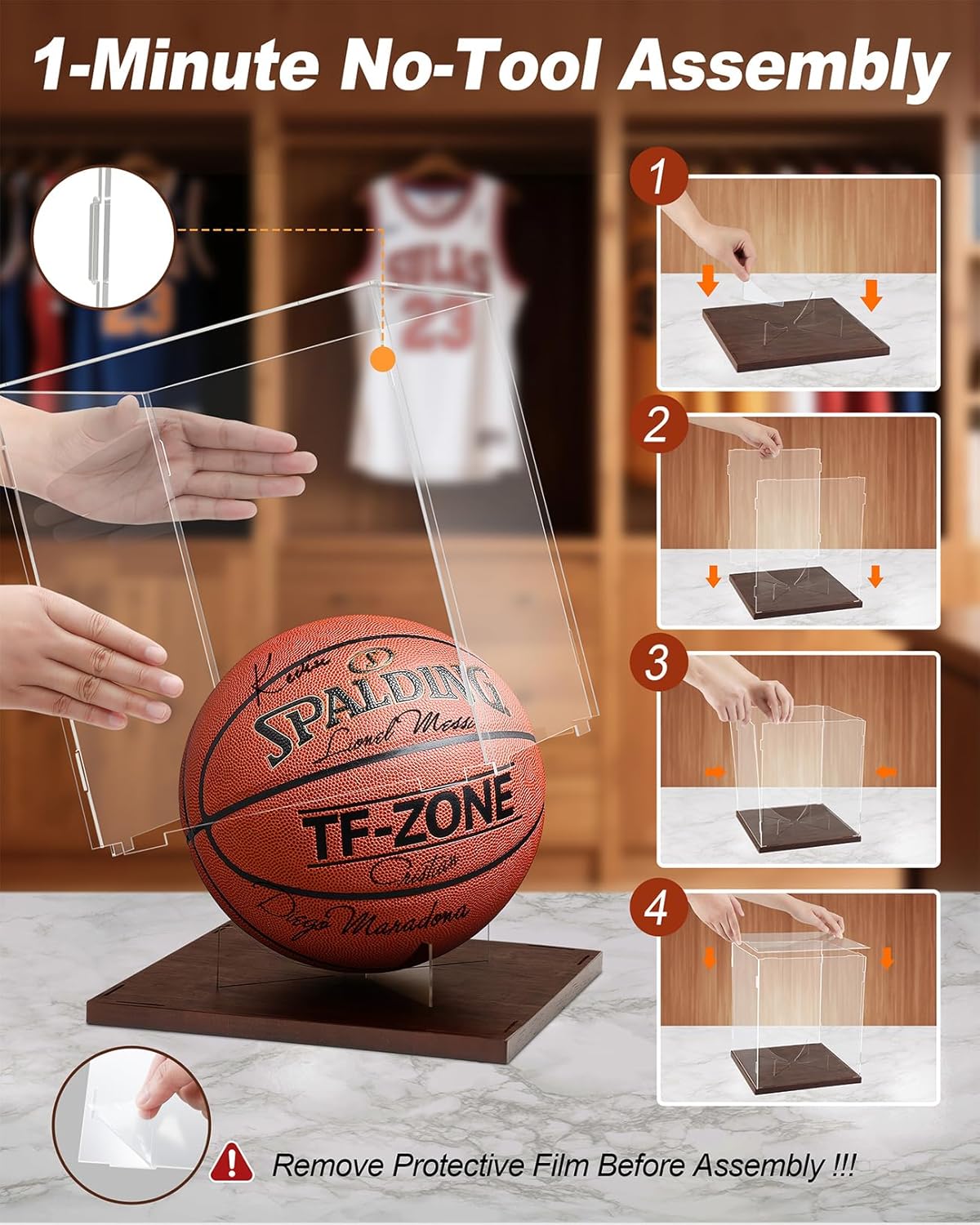 Our acrylic basketball display case assembles tool-free in under 60 seconds using interlocking joints. Simply remove protective film from edges and snap components together – no glue or tools needed.