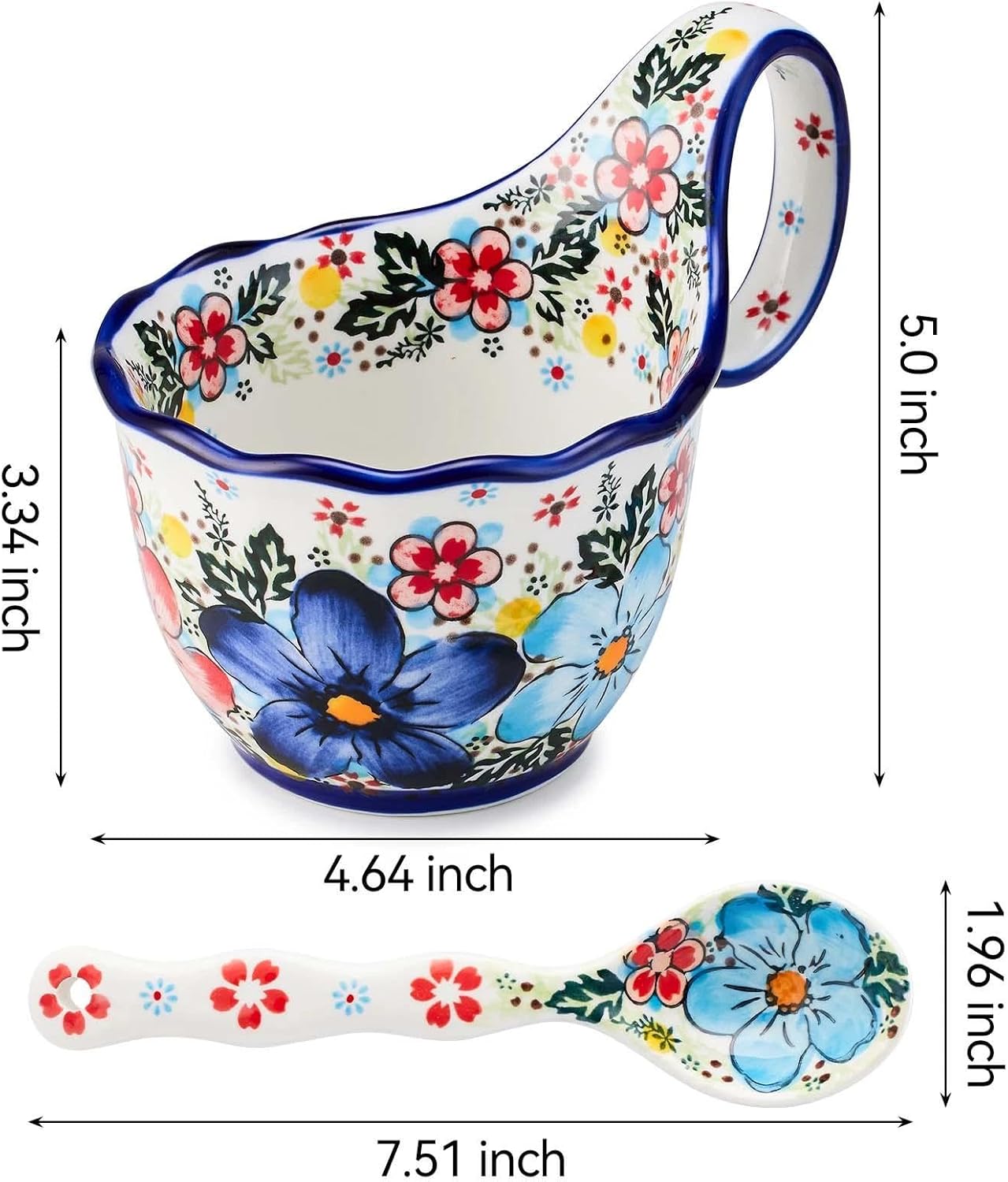 【Dimensions and Capacity】This soup bowl with handle measures 7 inches long x 4.7 inches wide x 5.68 inches high and holds 18.5 ounces. Its intricate hand-painted pattern lends it a unique artistic flair, adding elegance to your table.