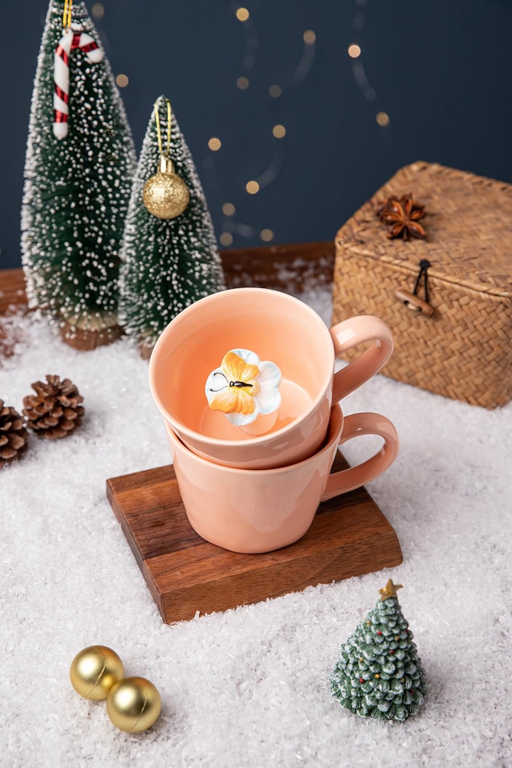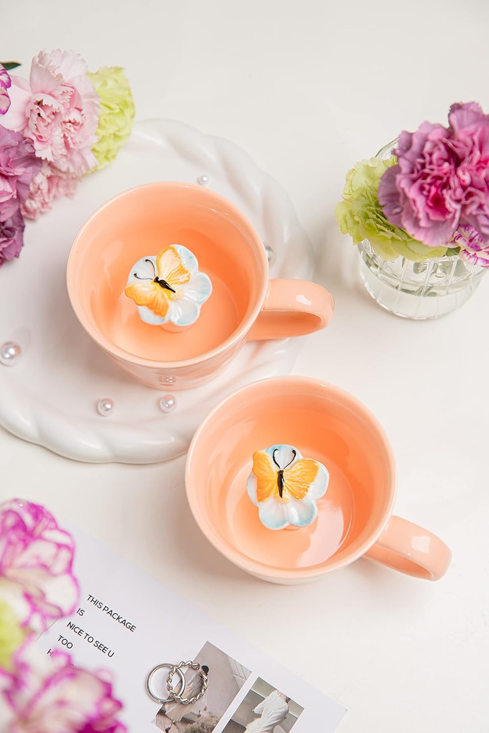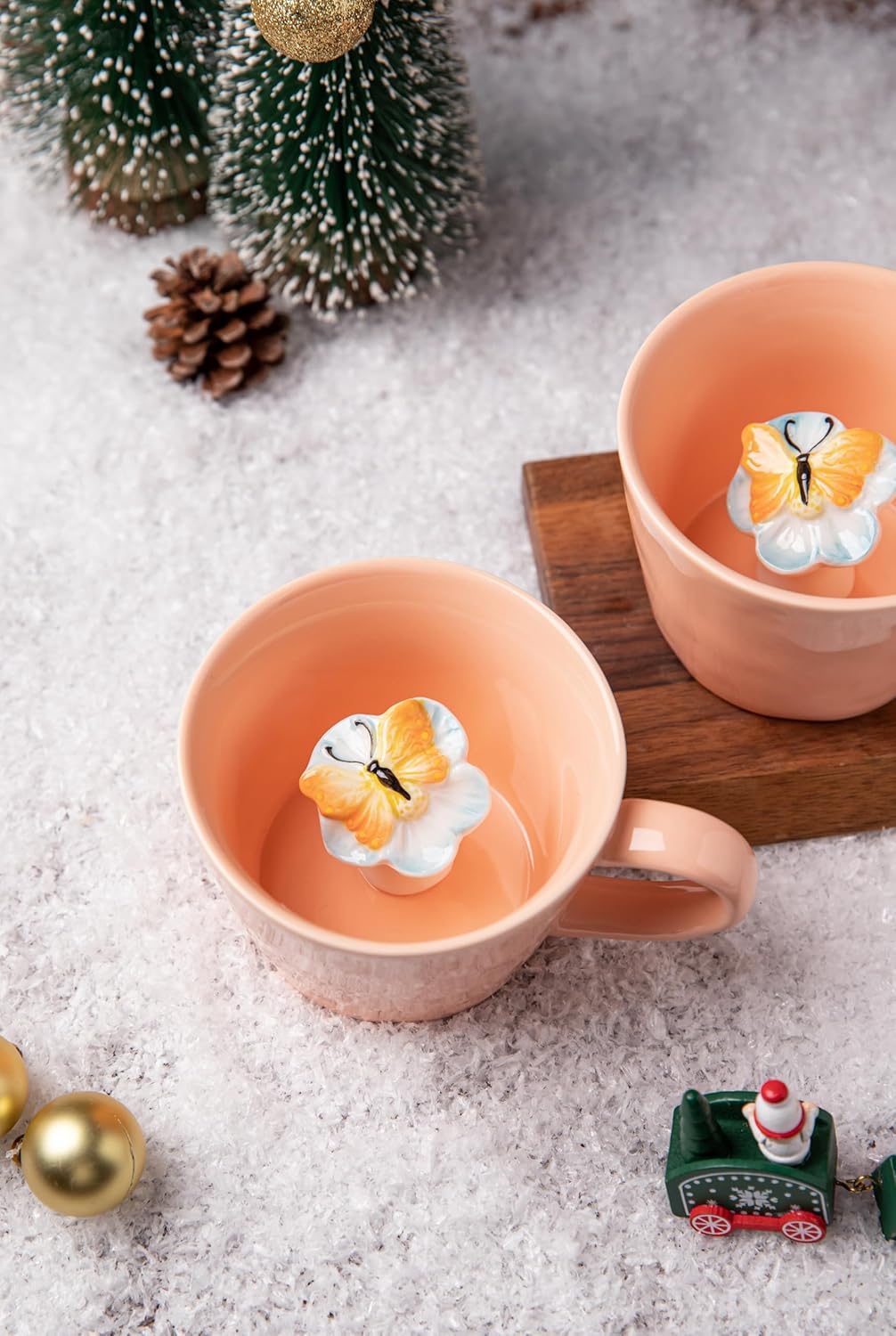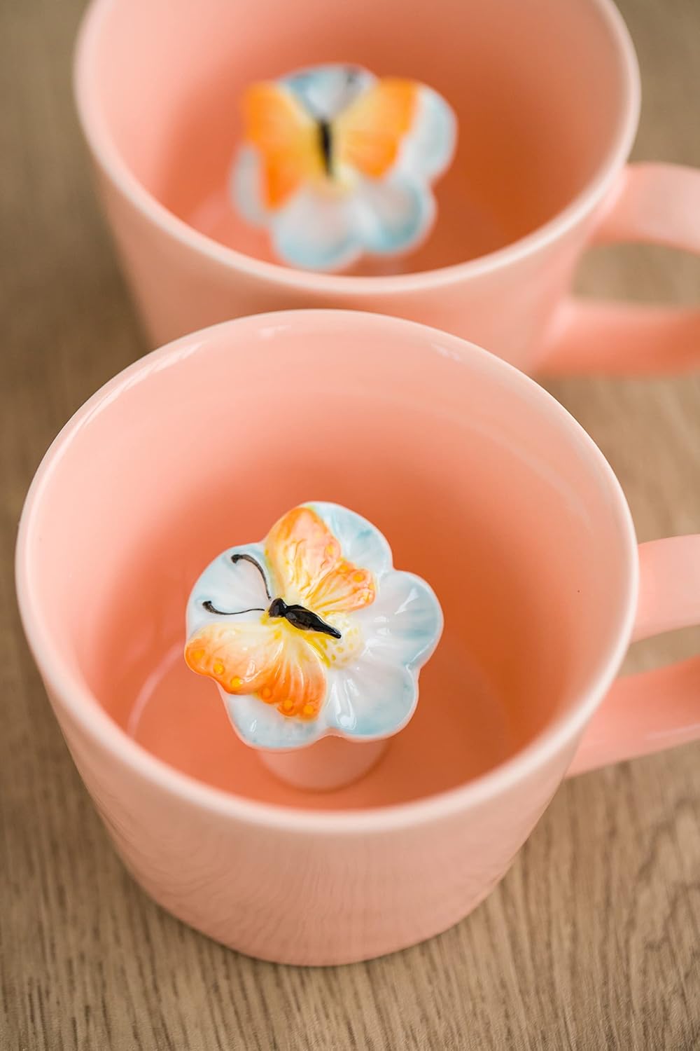 DIHOclub Ceramic Butterfly Cup Hidden 3D Animal Inside Mug,Garden series Handmade Figurine Butterfly Mugs 12OZ(light pink)