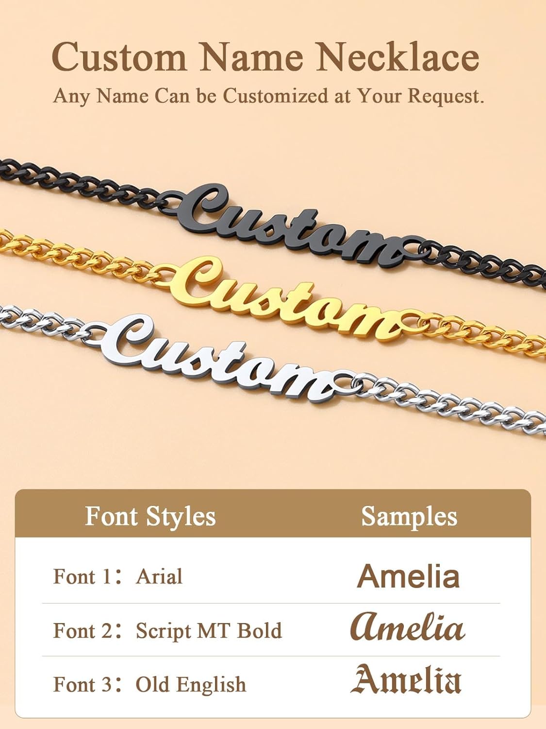 We offer 6 types of name necklaces: single figaro/cuban chain & layered bead chain/cuban chain/figaro chain/herringbone chain (Each type has 3 color options: gold/silver/black) –You just need to click “Customize Now”, enter the name, then we will make a beautiful custom name necklace.