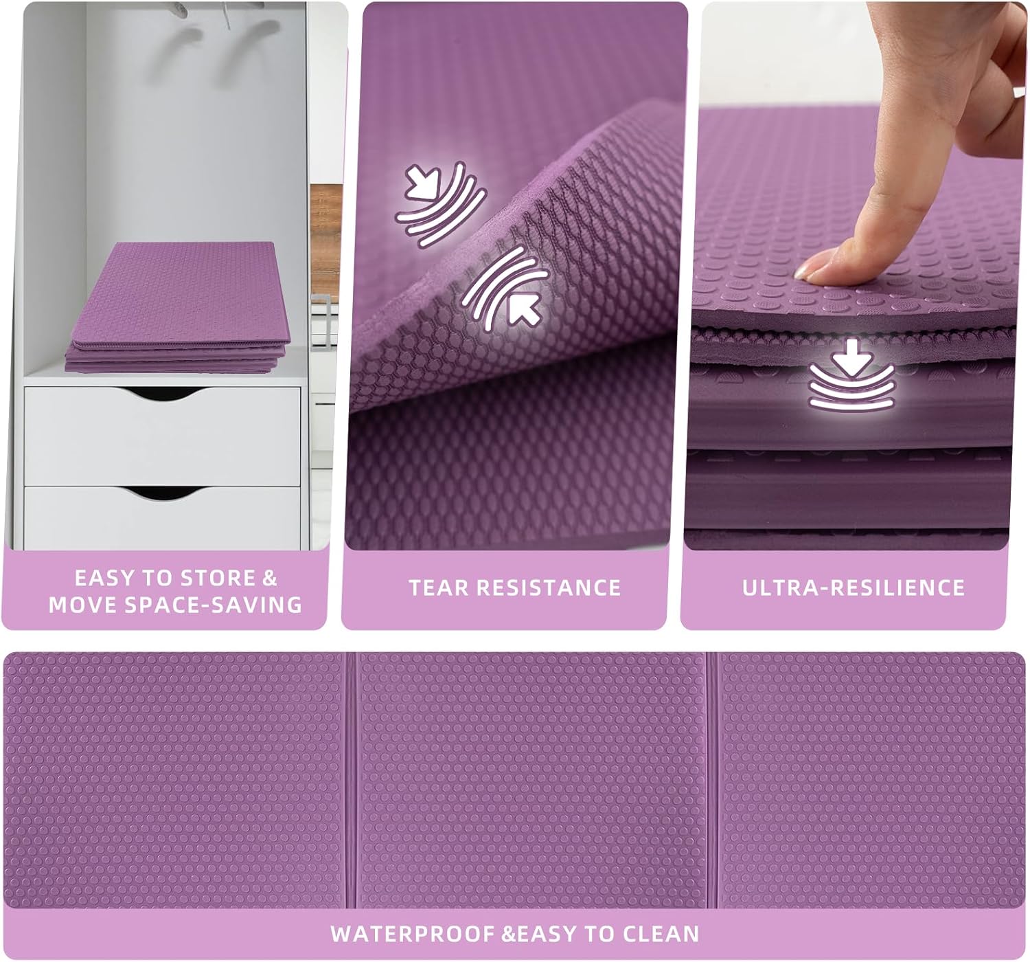 Foldable Design: This 72″x24″x0.24″ foldable yoga mat folds compactly and includes a storage bag, turning it into a portable travel yoga mat for easy transport to home, gym, or outdoor workouts.