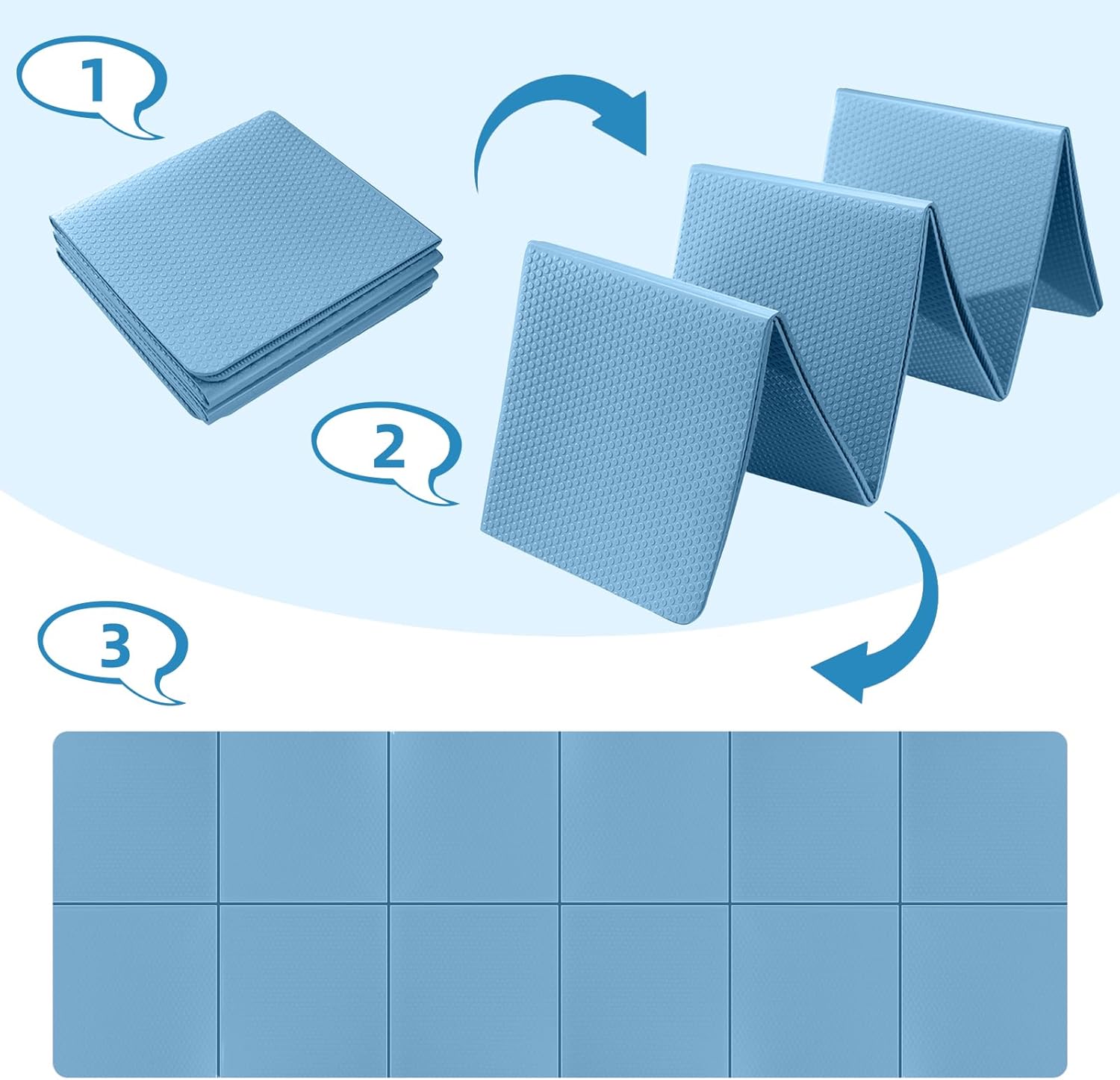 Convenient Foldable Design:The travel-friendly yoga mat folds compactly (72″x24″x0.24″) and includes a storage bag for easy transport and organization—perfect for home, gym, or outdoor use.