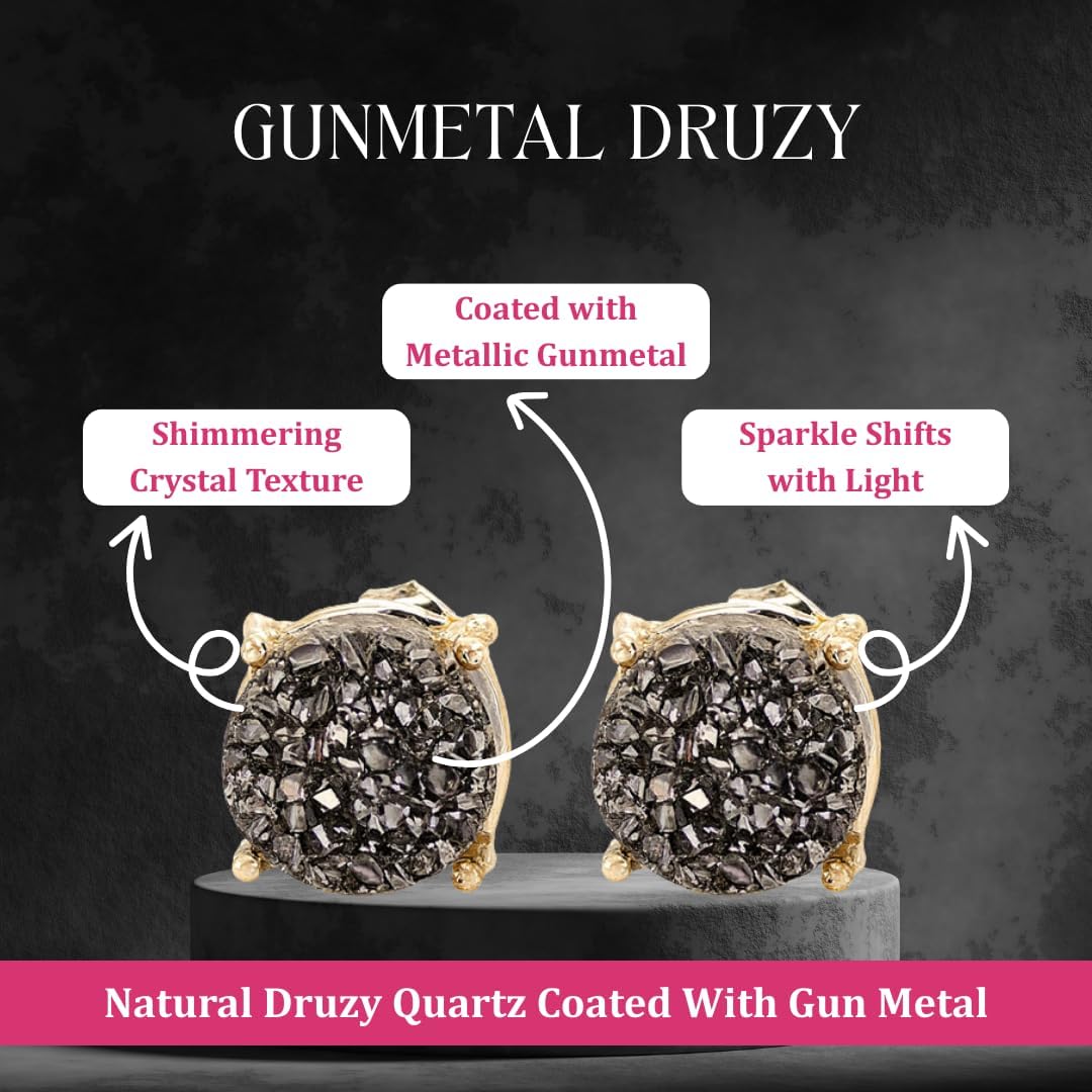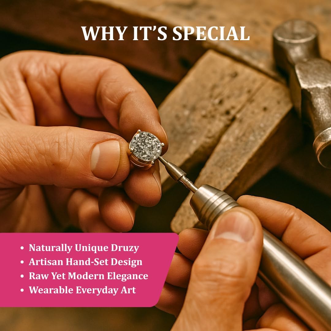 - Gemstone: Natural druzy crystals (8–10 mm, round flat cut)