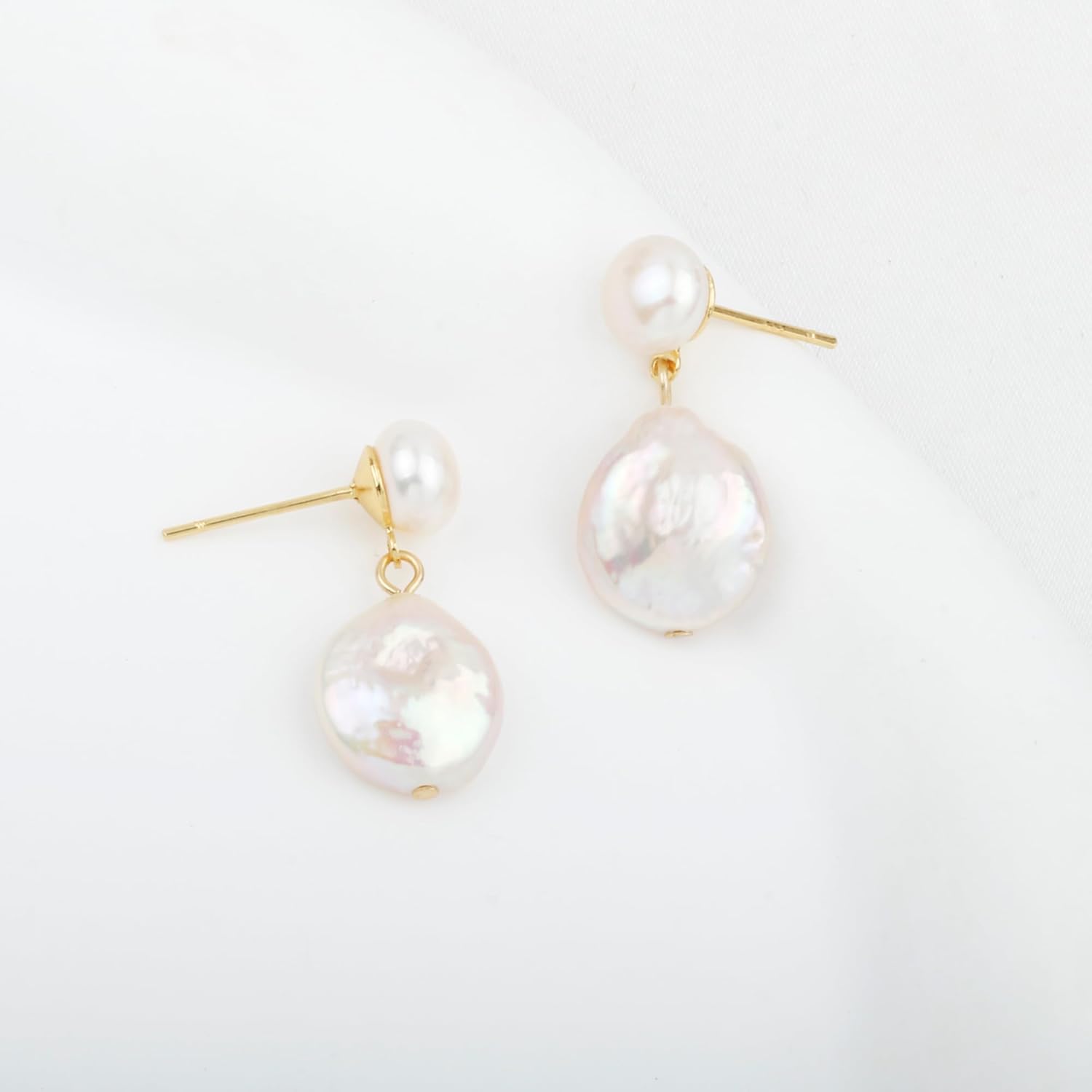 These earrings feature 11-12 mm coin pearls, near round shape, semi baroque for each, which are known for their irregular shapes and natural beauty, lustrous pearls dangle gracefully