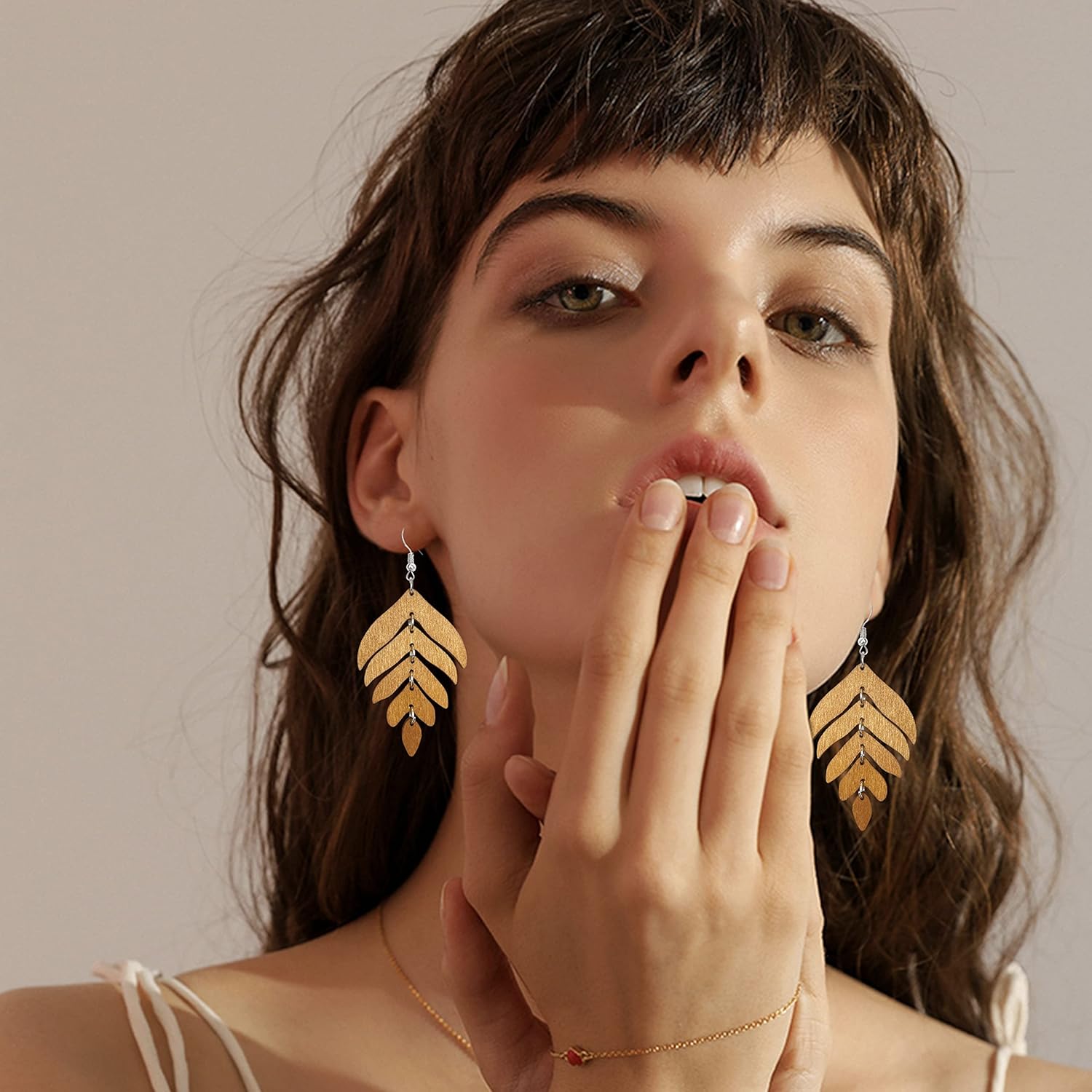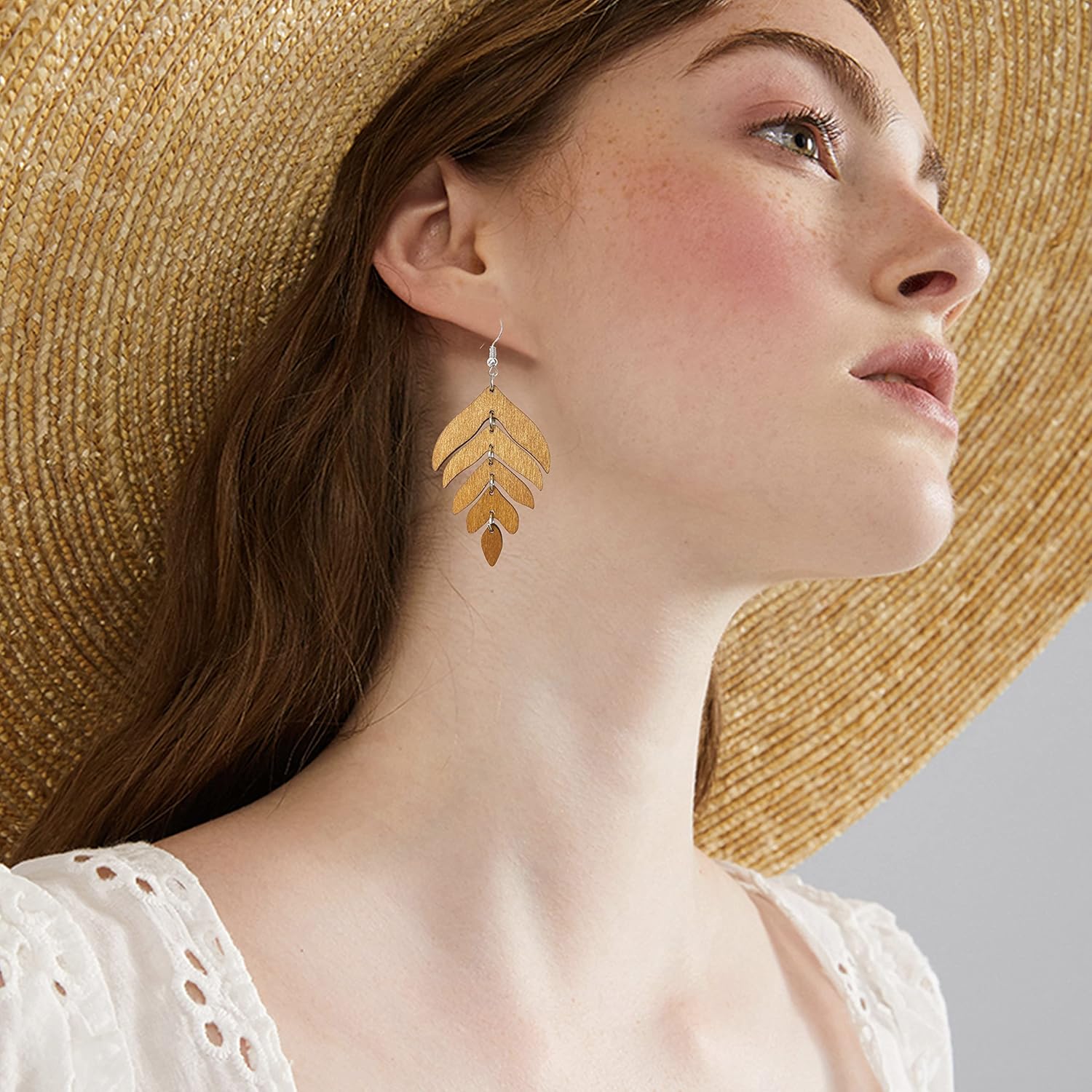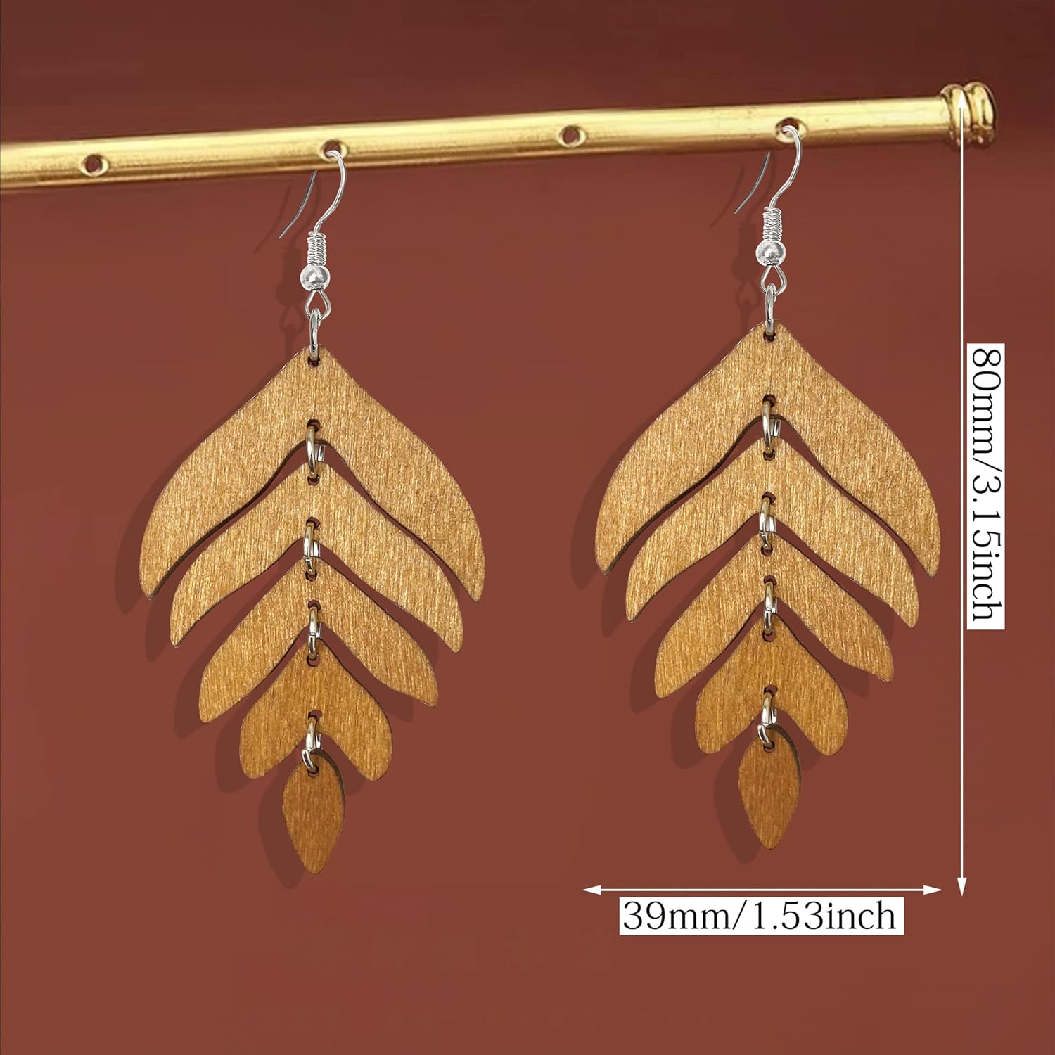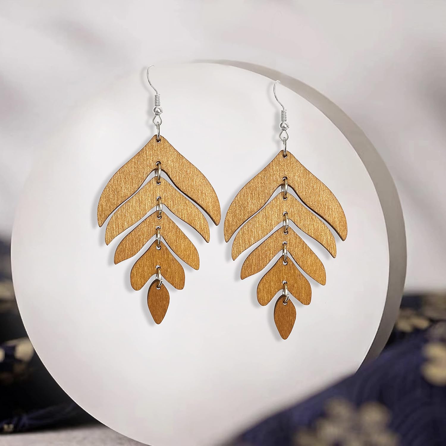 Handmade Lightweight Wooden Leaf Drop Dangle Earrings Bohemian Nature Wood Chain Leaf Earrings for Women Mom Sister Daughter