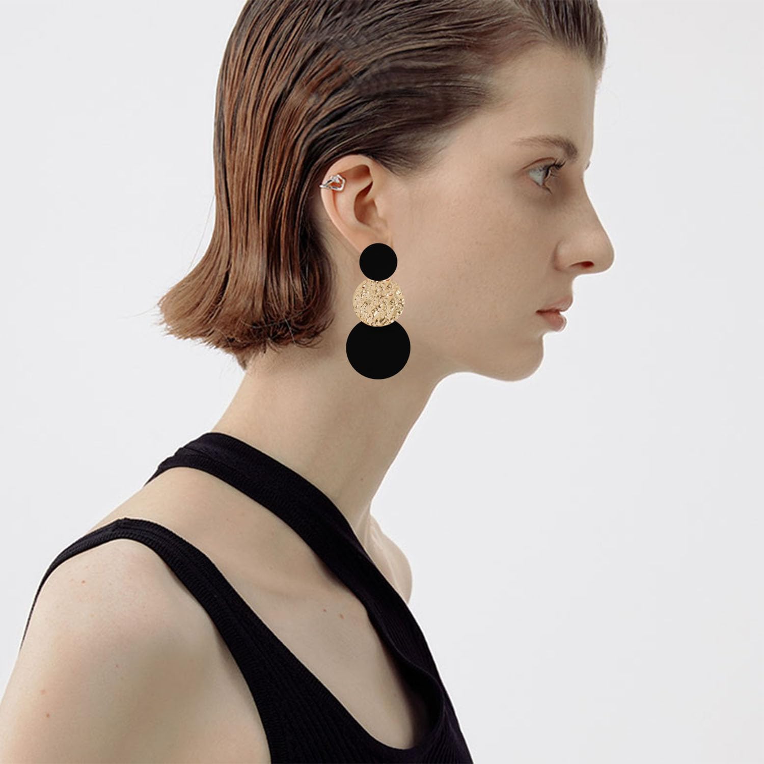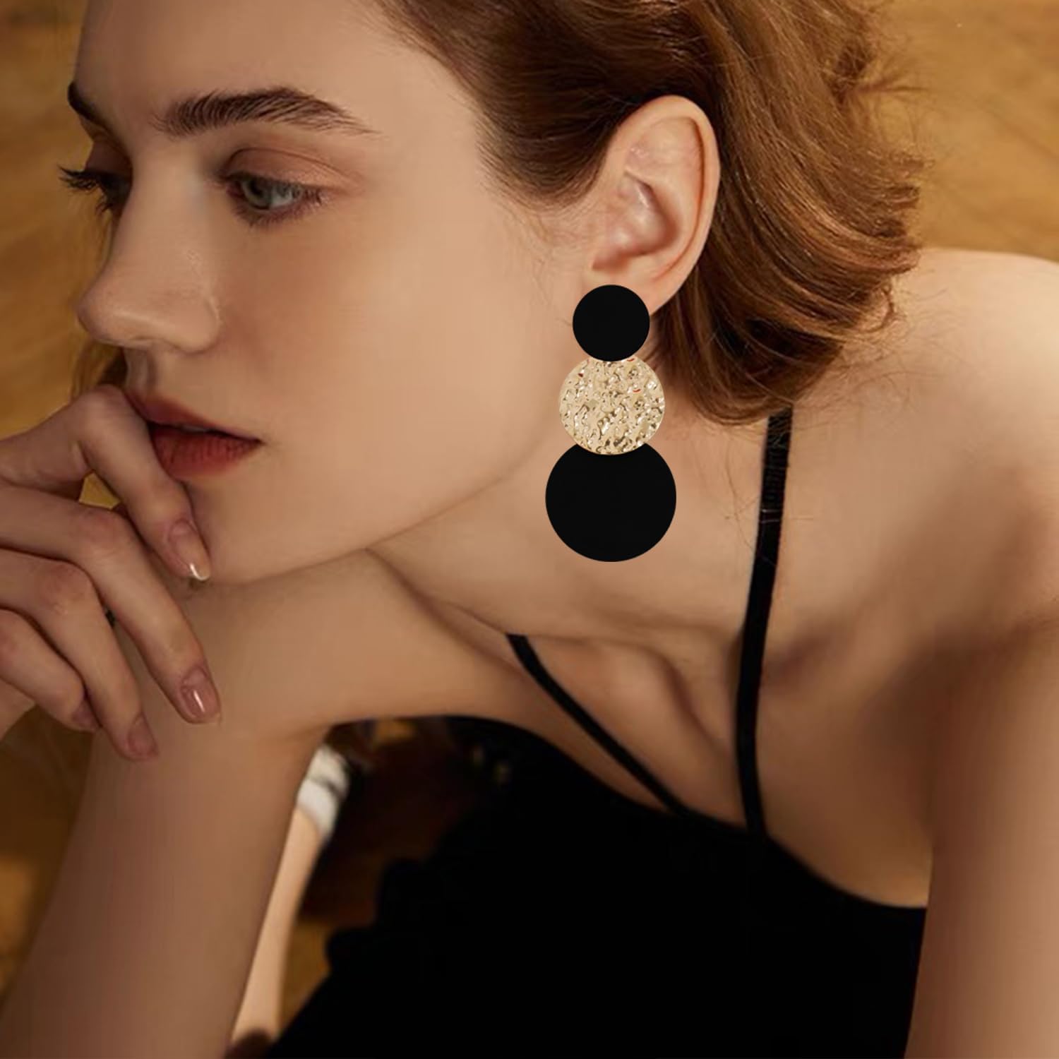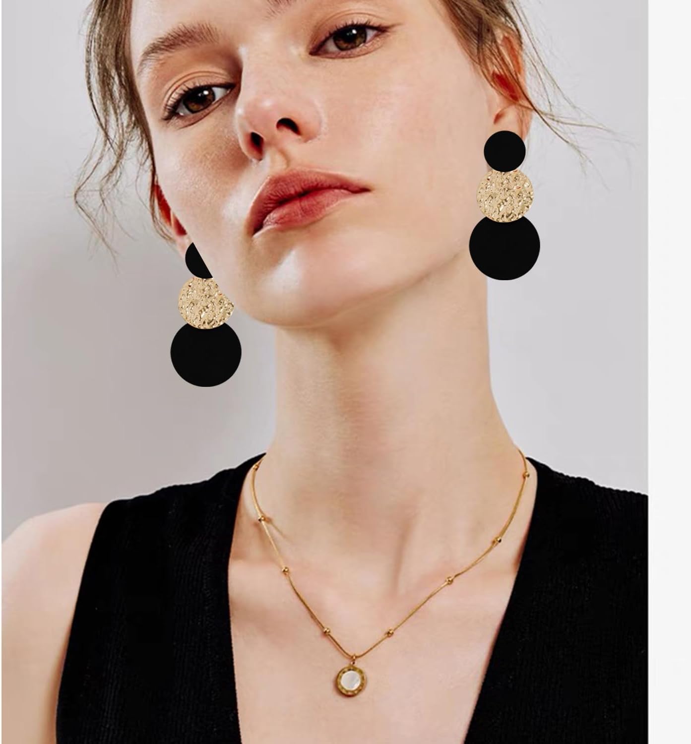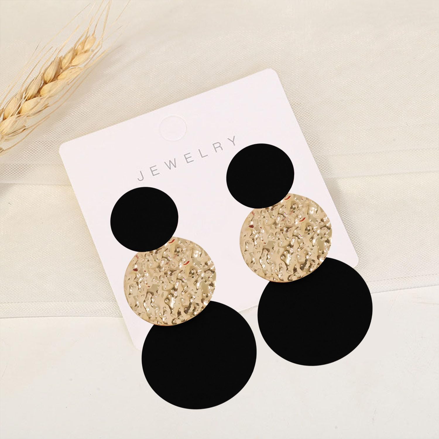 These large disc earrings are long but dainty, those 3 discs would collide when the wind blows, and you may hear some a very pleasant sound. It reflect just enough light to draw attention while not overdoing the look