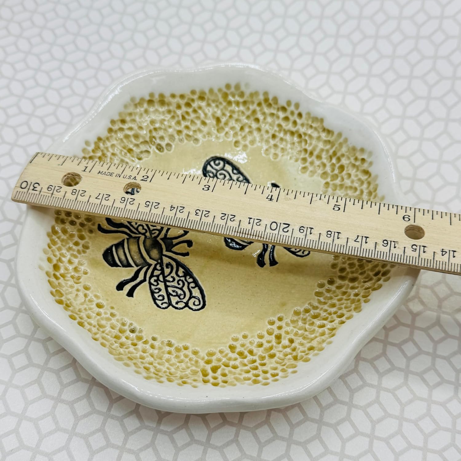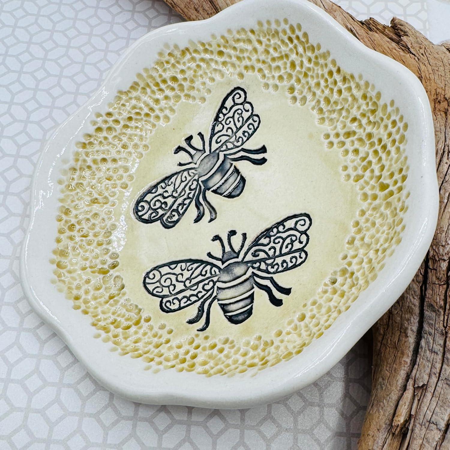 Handmade pottery honey bees bowl measures 6.5″ round x 1.25″ height.