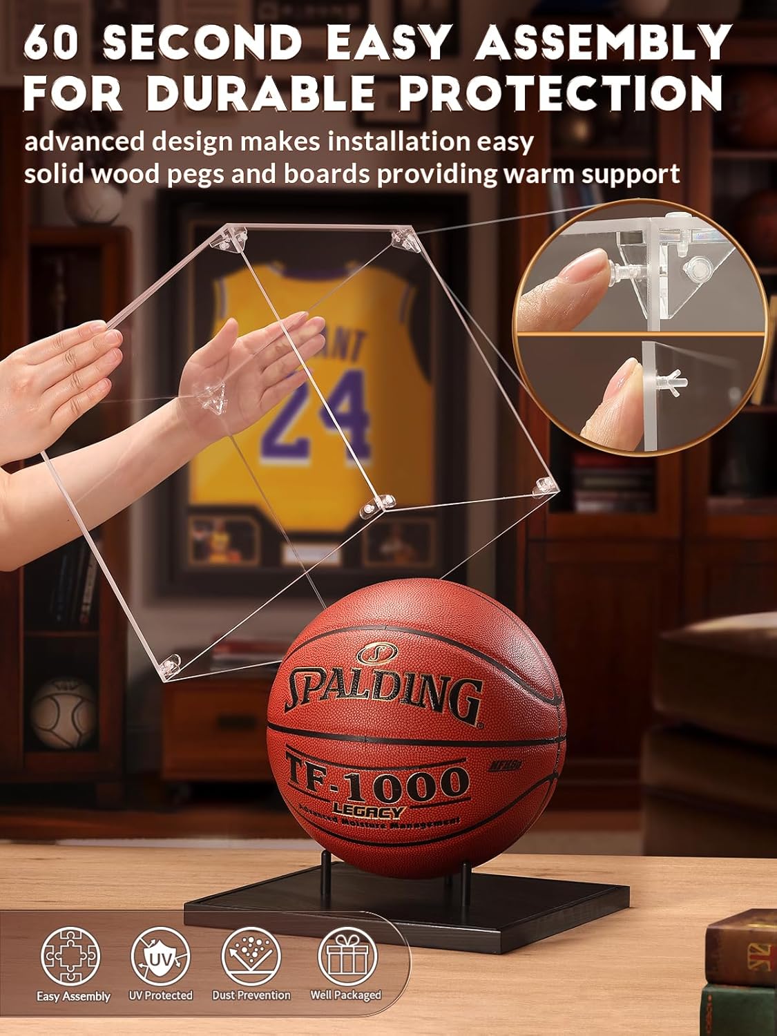 Classy wooden base for elegant display and show to friends Super clear to show the basketball and signature on the basketball High quality acrylic, thick enough and hard to break UV protected, saves your precious basketball from fading 3 pack cylindrical wooden pegs hold the ball firmly in place, creating a stunning display large acrylic box is capable of holding a full-size basketball Nice package to be an ideal gift for birthdays and holidays, suitable for different decorations such as modern, farmhouse, and rustic