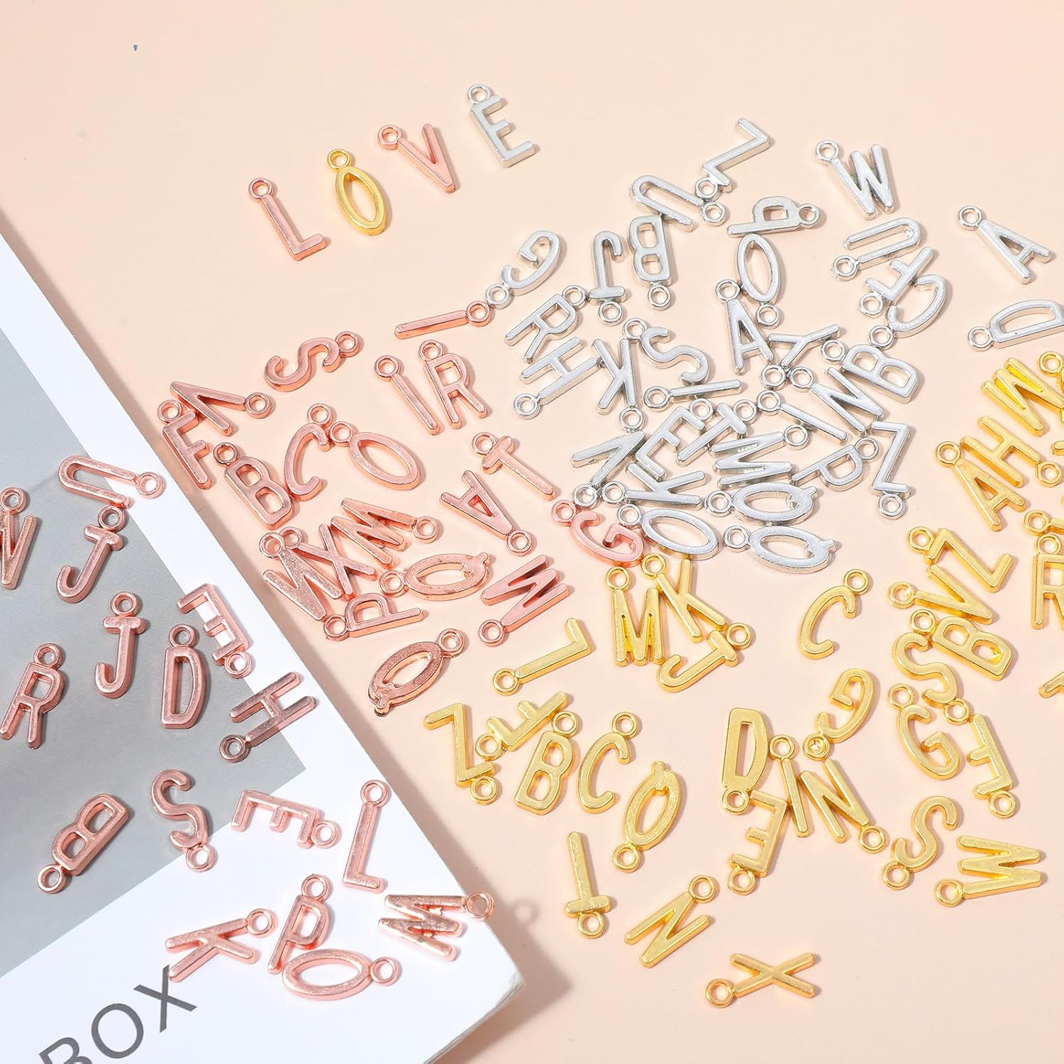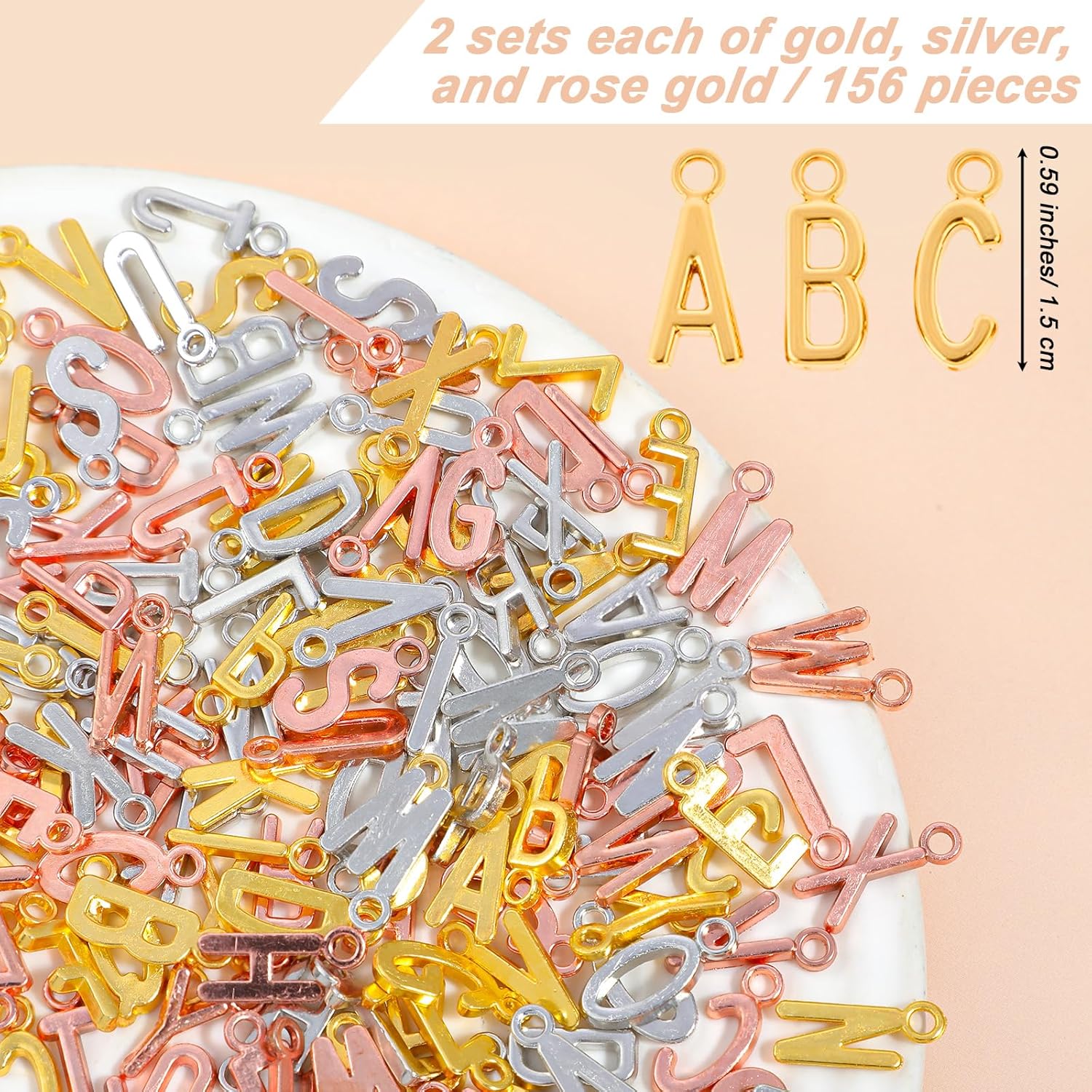 Create stunning personalized jewelry with this 156PCS Letter Beads Set! Featuring gold, rose gold, and white K alphabet charms (1.5cm each), this zinc alloy bead collection lets you craft custom name bracelets, necklaces, or charms for Women. The included jump rings make assembly effortless—perfect for DIY beginners or experienced crafters.