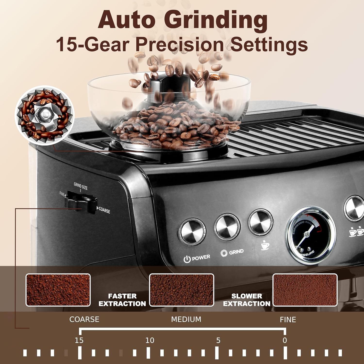 【EASY TO USE】This espresso machine offers an all in one espresso machine with an integrated grinder, has a power of 1450W, which can convert coffee beans into espresso in just one minute. And the latte maker cappuccino machine has 15 precision grinds to adjust, a manual removable magnetic tamper, and an extractable feedback pressure gauge. The entire coffee machine only requires simple button control.