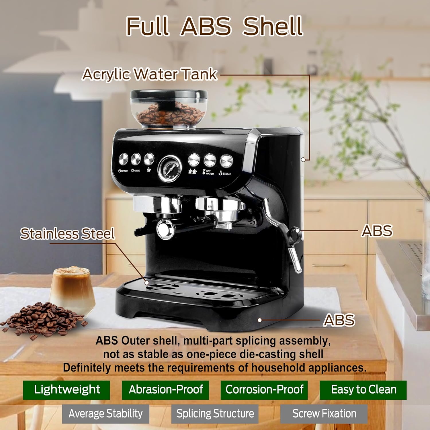 【ABS LIGHTWEIGHT DESIGN】The espresso machine is made of ABS material, which is lighter in weight, easier to maintain, will not rust and has superior insulation properties compared to stainless steel.