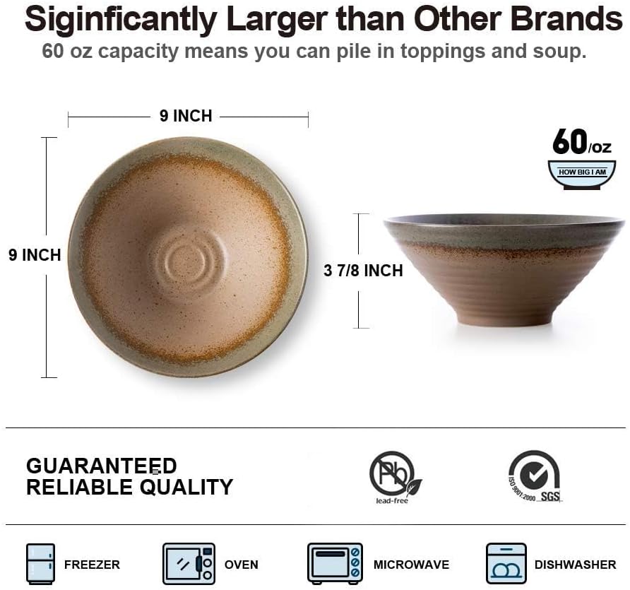 THE RIGHT SIZE: 60 fluid oz capacity can hold generous portions! Ramen restaurants in Japan use 50oz+ ramen bowls to hold their soup and noodles. This ensures toppings and soup sit securely in the bowl without spilling.