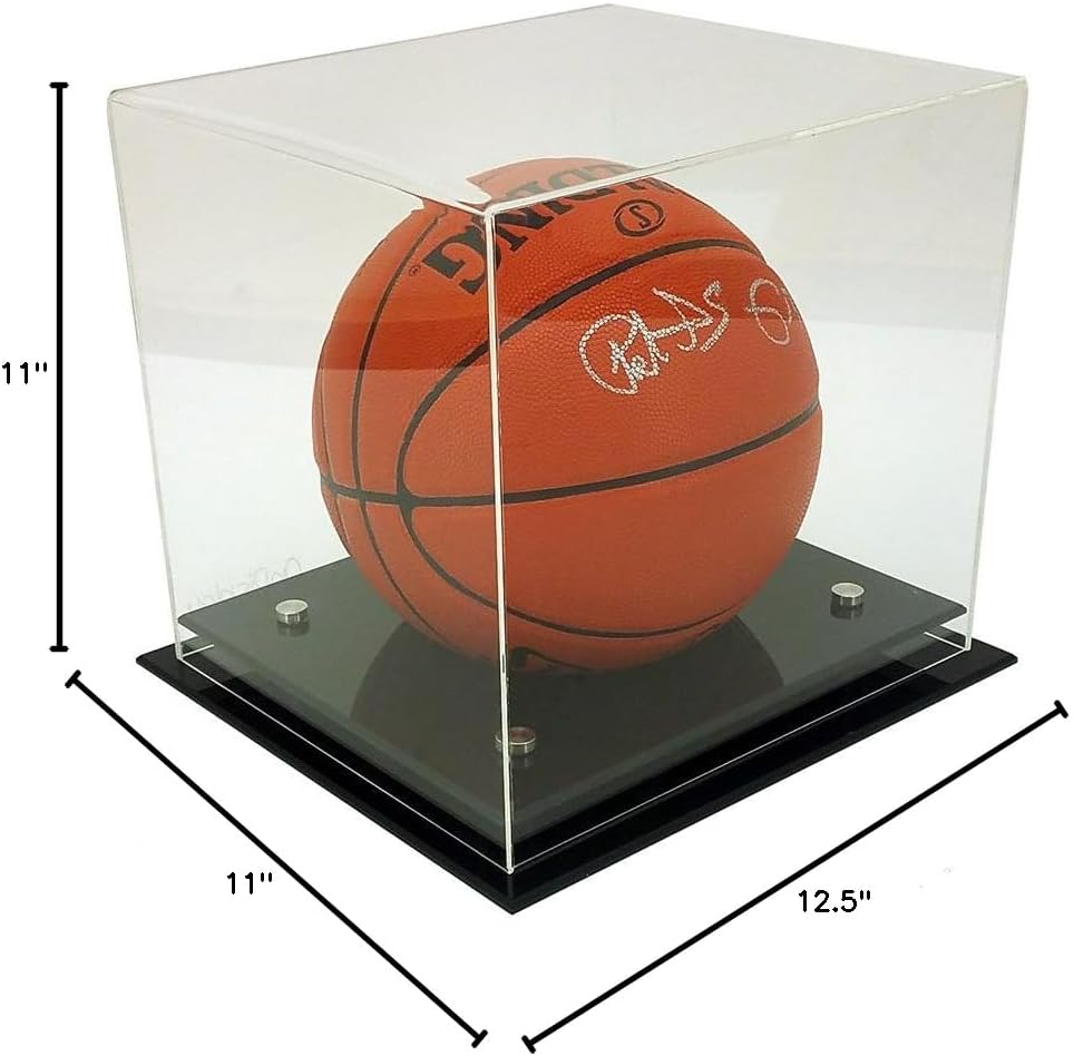 Our OnDisplay Basketball/soccer Ball display cases are a necessity for any true sports memorabilia enthusiast. Protect your investments and collectibles with our handmade UV-protected ultra Clear 5mm thick acrylic case. Preserve your Jordan Autograph for decades. Your memorabilia will be free of dust and will be protected from fading with our highest end display cases. Each 100Percent acrylic display case is hand-made and includes a removable top for easy access. With a black acrylic nest base with metal posts for added flair, your memorabilia will look stylish and protected in any setting. This Basketball case measures 11.8 inch x 12.8 inch x 11 inch tall. Can fit basketballs, soccer Balls and any other items up to 10 inch on any side. Ball not included.