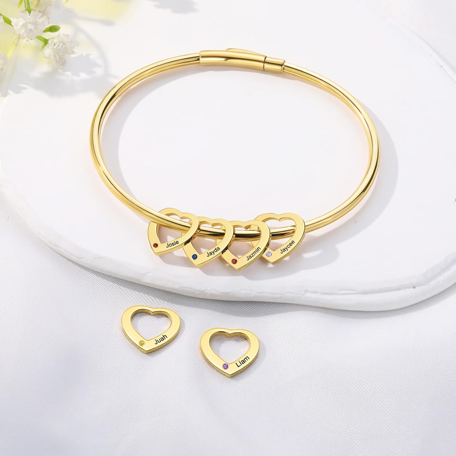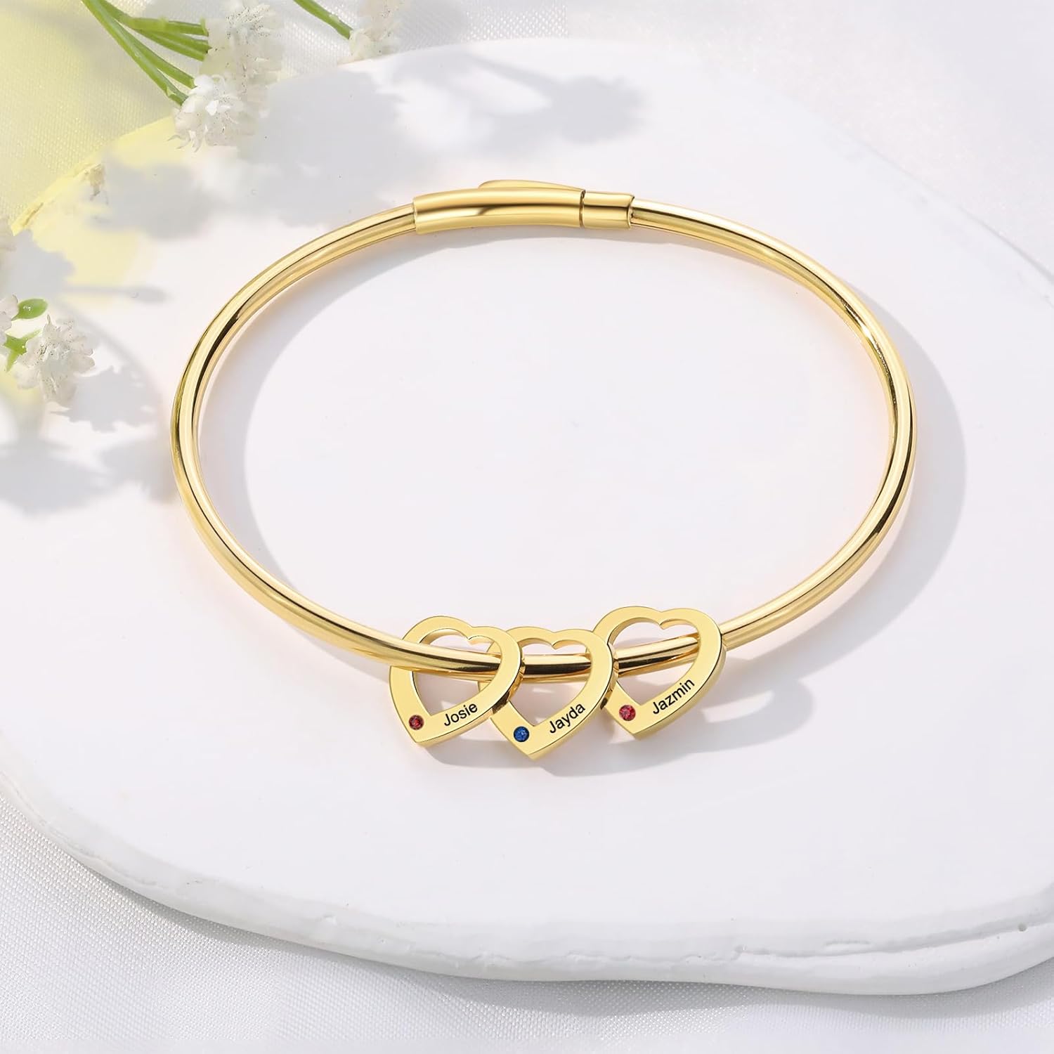 Made with high-quality gold plating, this bracelet is both sophisticated and durable. Its smooth finish, combined with the shimmering birthstones, makes this bangle perfect for any occasion—be it casual or formal. Whether you’re celebrating a birthday, Mother’s Day, Christmas, or honoring a cherished friend, this customizable bracelet becomes a timeless piece of jewelry that reflects your unique story.
