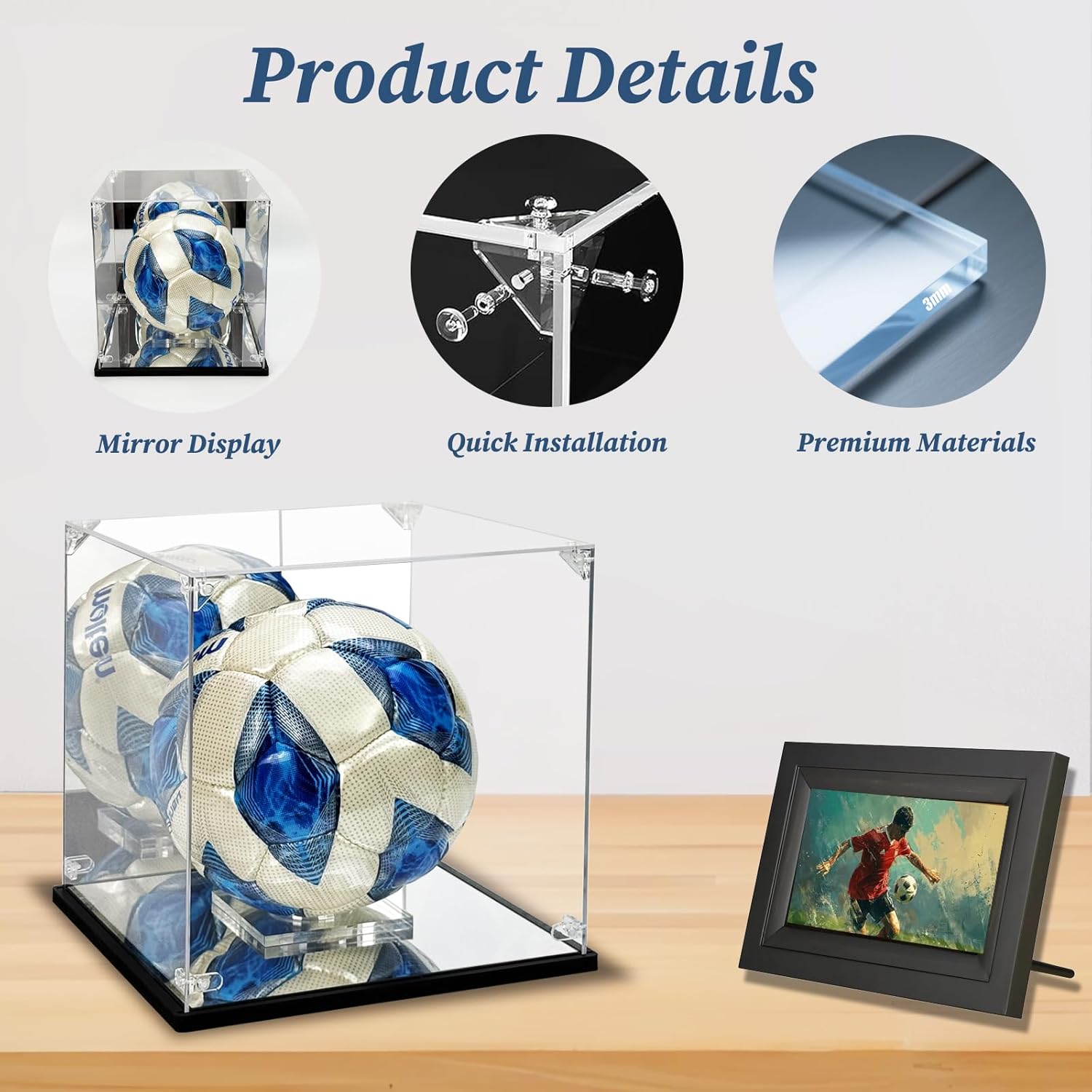 Removable Ball Stand: Includes a repositionable acrylic stand that securely holds standard Size soccer or basketball. Easily slide, adjust, or remove the stand to customize viewing angles or accommodate different displays.