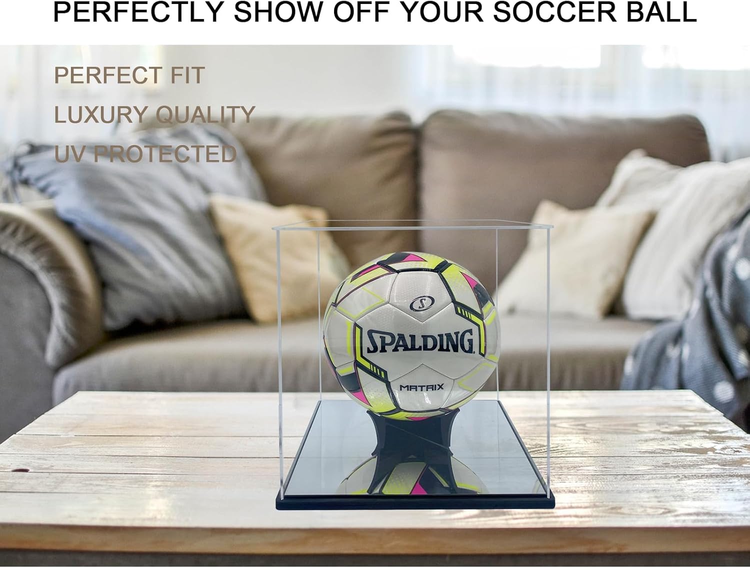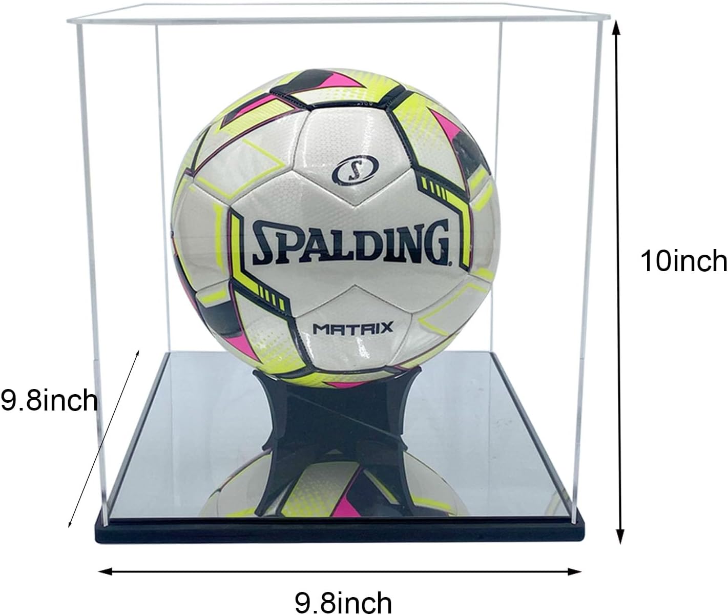 【Full size】The interior size is 9.8×9.8x10inch(L×W×H). Acrylic soccer ball display case is big plus to fit for all size of soccer ball and volleyball.
