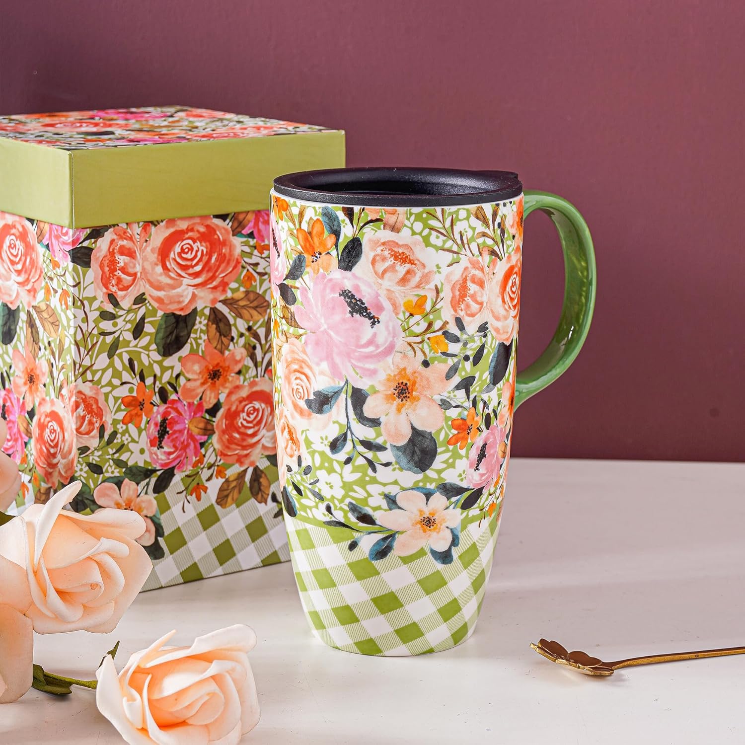 LIGHTWEIGHT AND PORTABLE: Ceramic travel coffee mug with present box and lid. The mug is perfectly designed for various occasions. With this travel mug, you can enjoy your coffee or hot tea at home, and it is also the best choice for travel