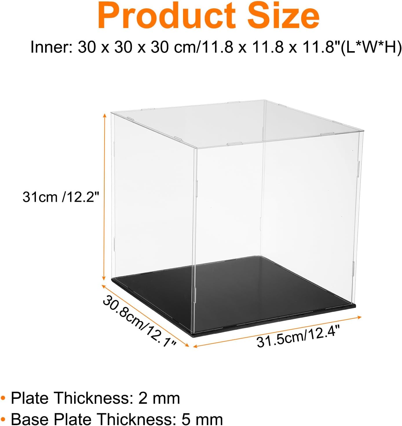 Dimensions: Outer Size: 31.5 x 30.8 x 31 cm/12.4 x 12.1 x 12.2 inch (L*W*H); Inner Size: 30 x 30 x 30 cm/11.8 x 11.8 x 11.8 inch (L*W*H); Base Plate Thickness: 5 mm. Providing ample space for collectibles and for a countertop display.