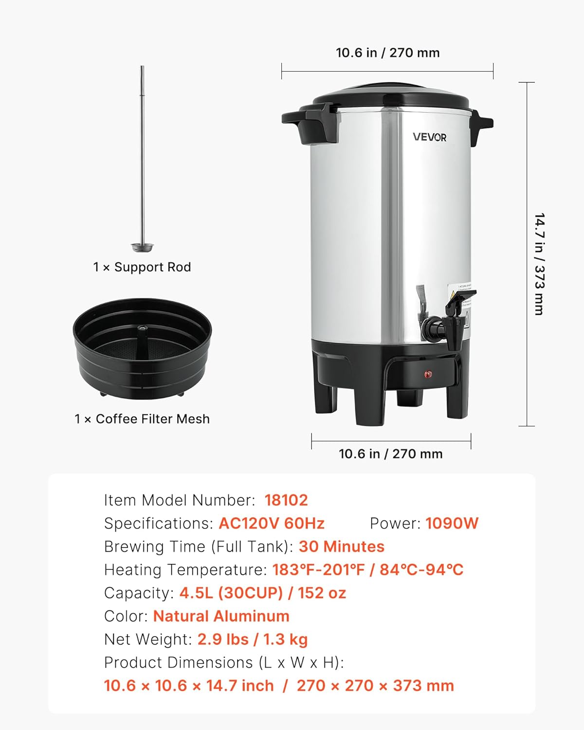 Efficient Large Capacity Brewing: This commercial coffee urn holds 4.5 L / 152 oz, brewing 30 cups at once. With a 1090W heating tube, it brews a full batch in ≦ 30 minutes, ideal for businesses and gatherings, reducing wait time with a nonstop hot coffee supply