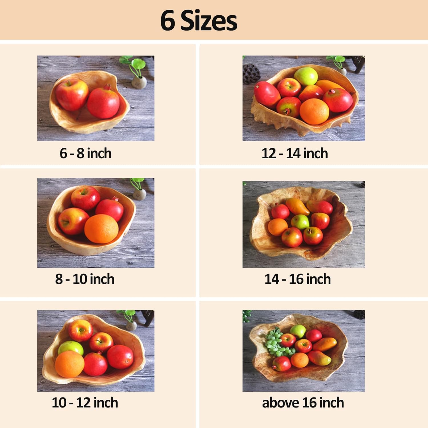 DIMENSION: There are 6 different sizes for you to choose: 6″-8″ Diameter, 8″-10″ Diameter, 10″-12″ Diameter, 12″-14″ Diameter, 14″-16″ Diameter, above 16″ Diameter. Please note that each rustic wooden bowl will be different in size even in same size range, some will be bigger, some will be smaller.