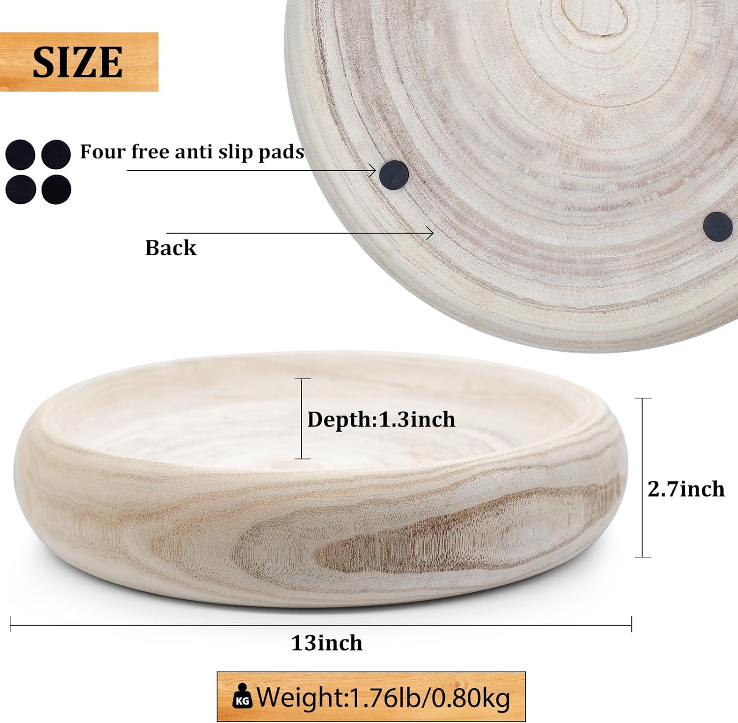 Wooden Decorative Bowls, 13 Inch Round Paulownia Wood Centerpiece Bowls for Home Decor, Natural Fruit Bowl for Coffee Table, Key Tray for Entryway Moss Holder (Wooden)
