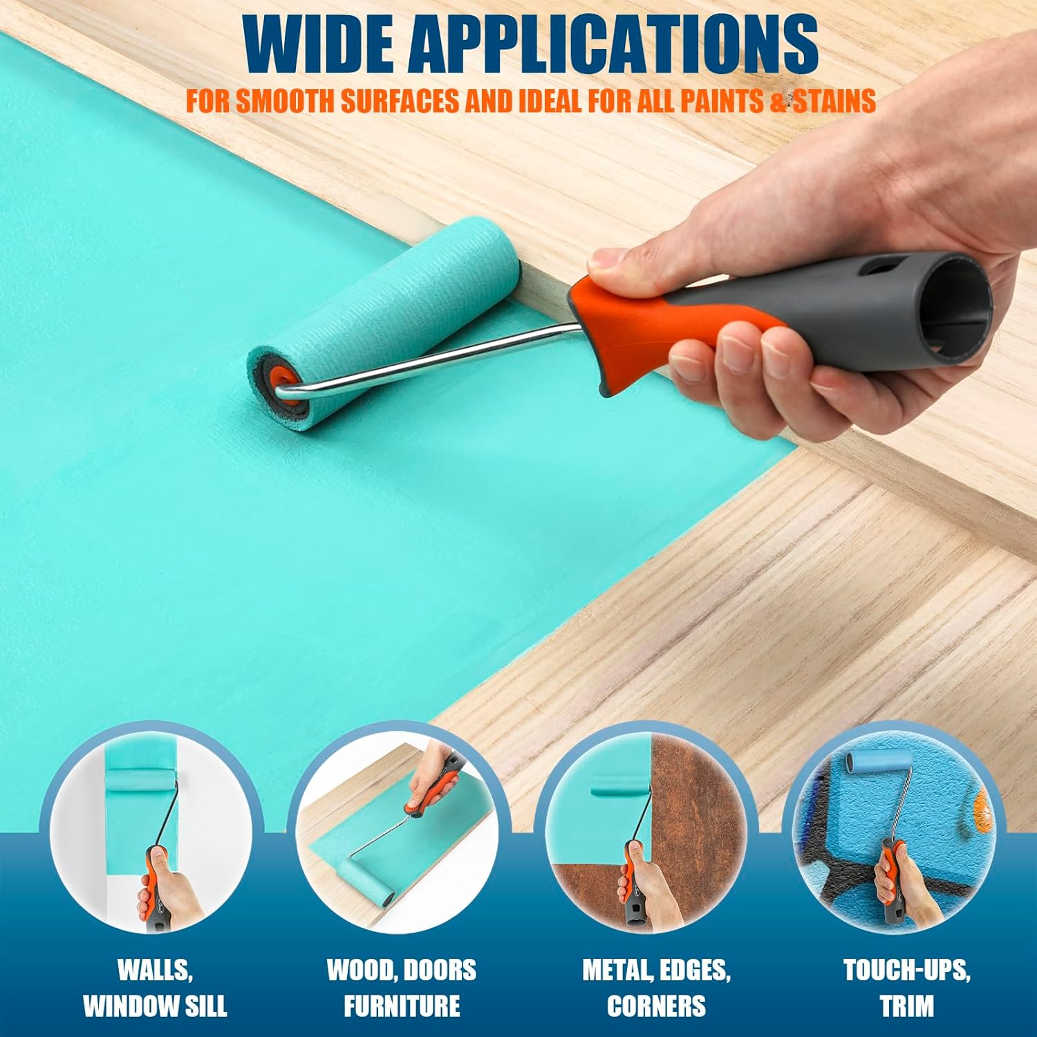 【Versatility】Our foam paint roller 4 inch is perfect for painting various surfaces such as smooth walls, doors, cabinets, furniture, etc. And especially suitable for detailed painting on corners, edges, baseboards, ceilings, trim, touch up and beyond.