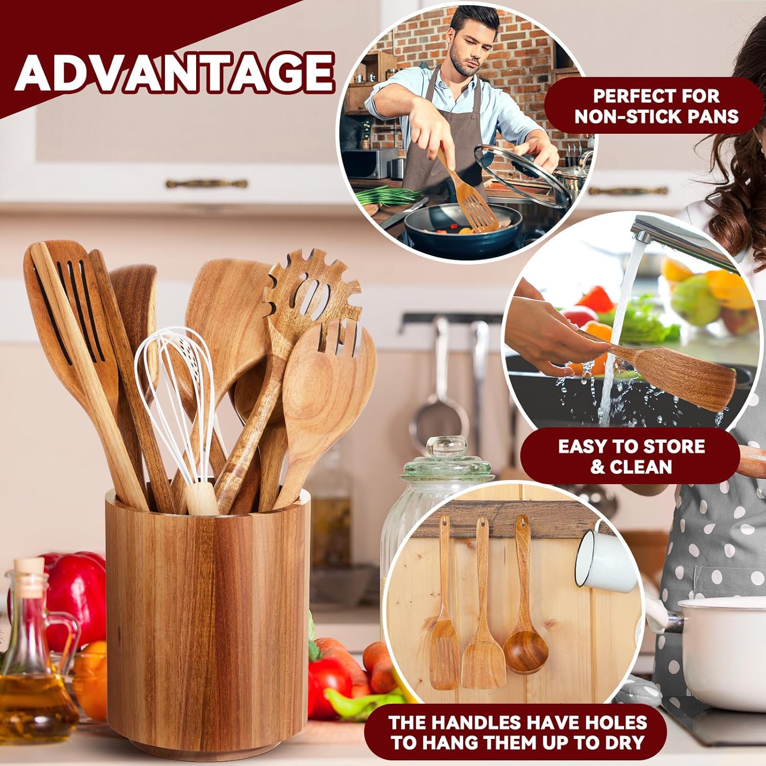 Space Saving Kitchen Essential: complete with a rotating wood cooking utensil holder, this set is ideal for organizing your kitchen space; Each piece in the wooden utensils for cooking set has a convenient hanging hole, making storage easy; It’s a special gift for cooking enthusiasts seeking efficiency and cleanliness