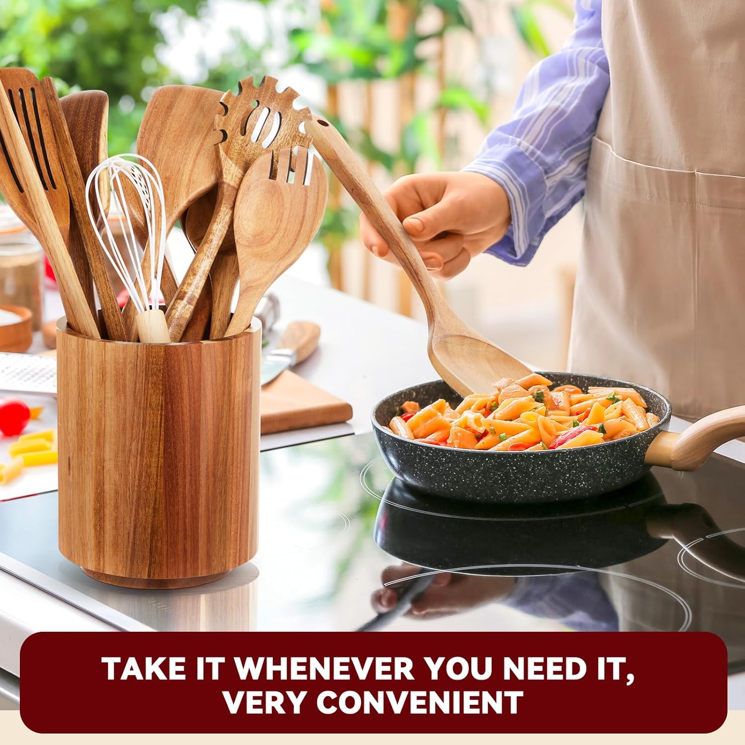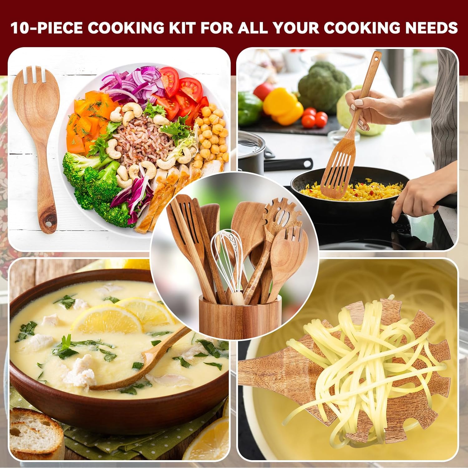Ideal Combination for Cook: this wooden utensil set with holder includes 10 essential tools include spatula, frying spatula, colander, soup spoon pasta spoon, tongs, strainer, salad fork, mixing spoon, whisk, all neatly stored in a spacious, rotating wood cooking utensil holder; It’s designed to meet all your cooking needs while keeping your kitchen tidy