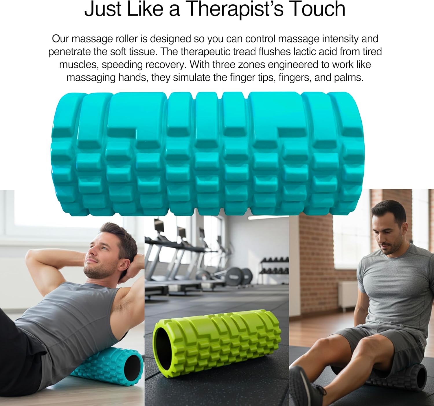 Start with our classic triple zone premium massage roller, great for flushing lactic acid and stretching your legs and lower back. Its unique texture mimics the thumbs, fingers, and palms of a massage therapist’s hands