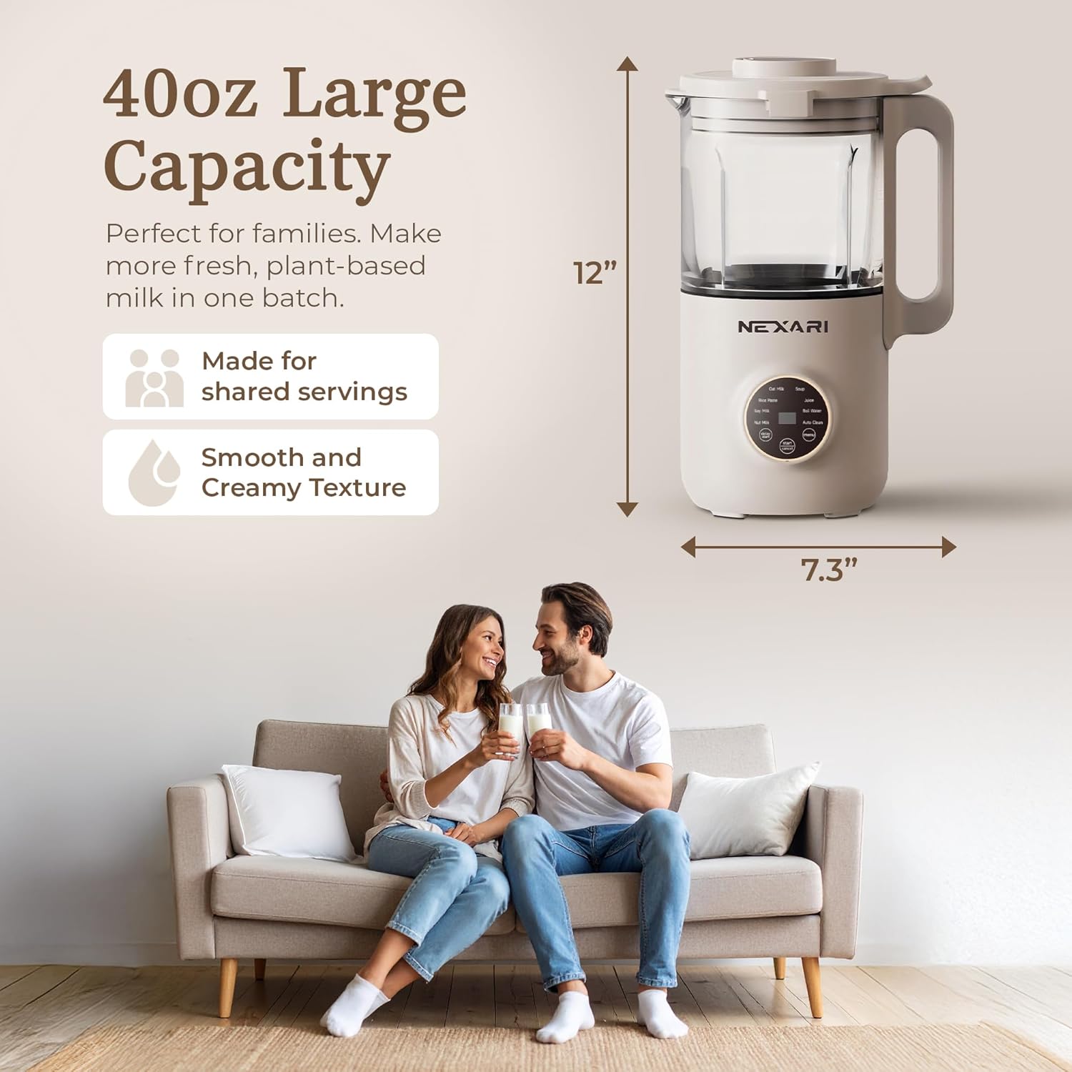 8-in-1 Multifunctional soy milk maker Machine – Large 1.2L Capacity – The Nexari Nut Milk Machine is designed for versatility, allowing you to make fresh almond, oat, soy, cashew, and coconut milk, as well as smoothies, soups, soy milk, and rice paste. With a generous 1.2-liter capacity, you can prepare multiple servings at once—perfect for families or meal prep.