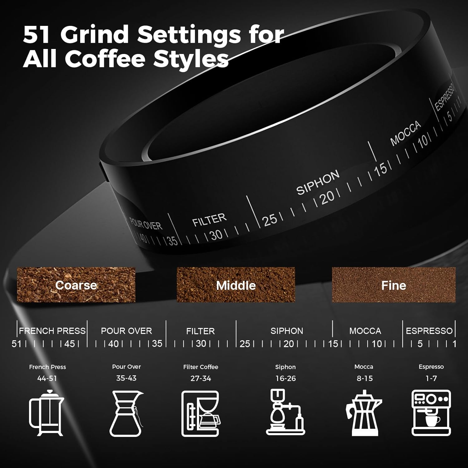 51 Custom Grind Settings: With 51 grind settings, this adjustable coffee grinder lets you precisely adjust for espresso, drip, pour-over, moka pot, or French press. Whether it’s a solo cup or party brew, this coffee grinders for home use adapt to your needs—perfect for home baristas seeking ultimate flexibility and control.