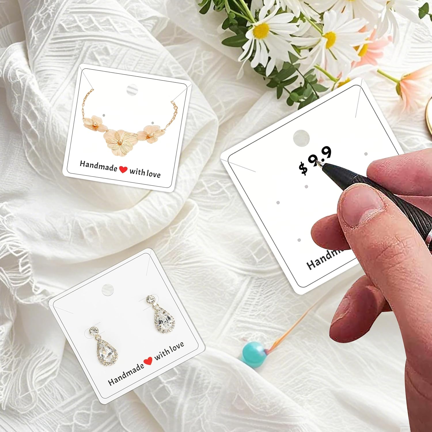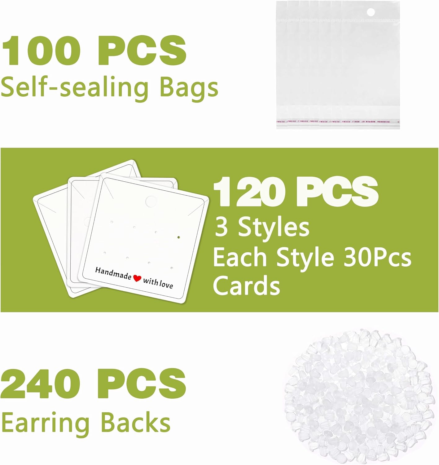 Value Earring Bundle: 120 stylish display cards (3 designs, 30 cards each), 100 self-sealing bags, and 240 earring backs!great value and long lasting. Perfect for storing or displaying earrings necklace or other jewelries,save your time & money with this ready-to-use kit while charming customers with ‘Handmade with Love’ heart-printed cards