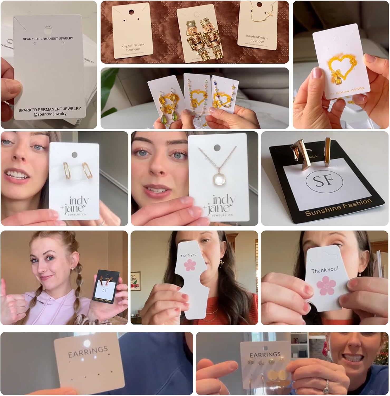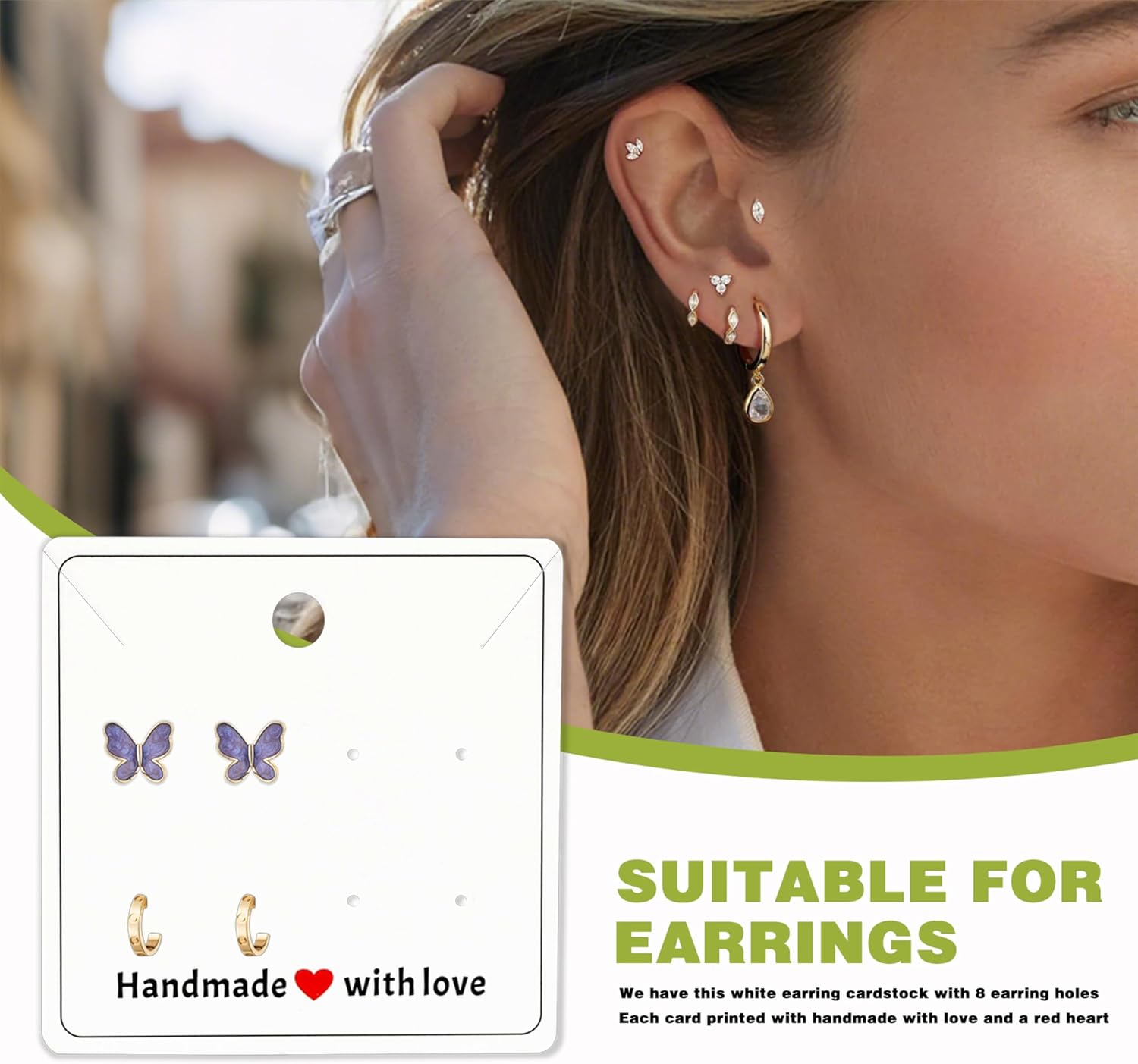 3 different earring cards fits for earrings, studs, ear clips, there are also diagonal cut lines on the cardstock to hang necklaces, hair bands cards can hang bracelets, keychains chokers and anklets…