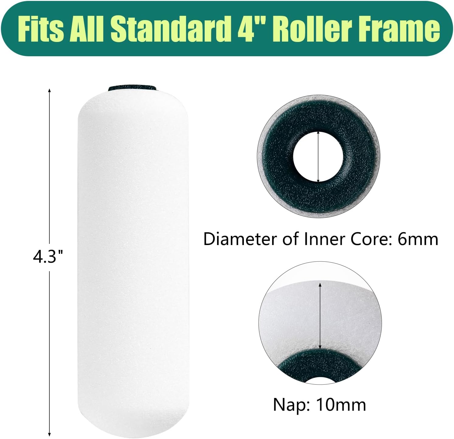 The paint kit includes 10 4-inch round-head foam roller covers with large sponge pores that provide excellent paint absorption and release performance, reducing the number of refills, providing even coverage, and minimizing drips and mess during application, thereby accelerating project completion