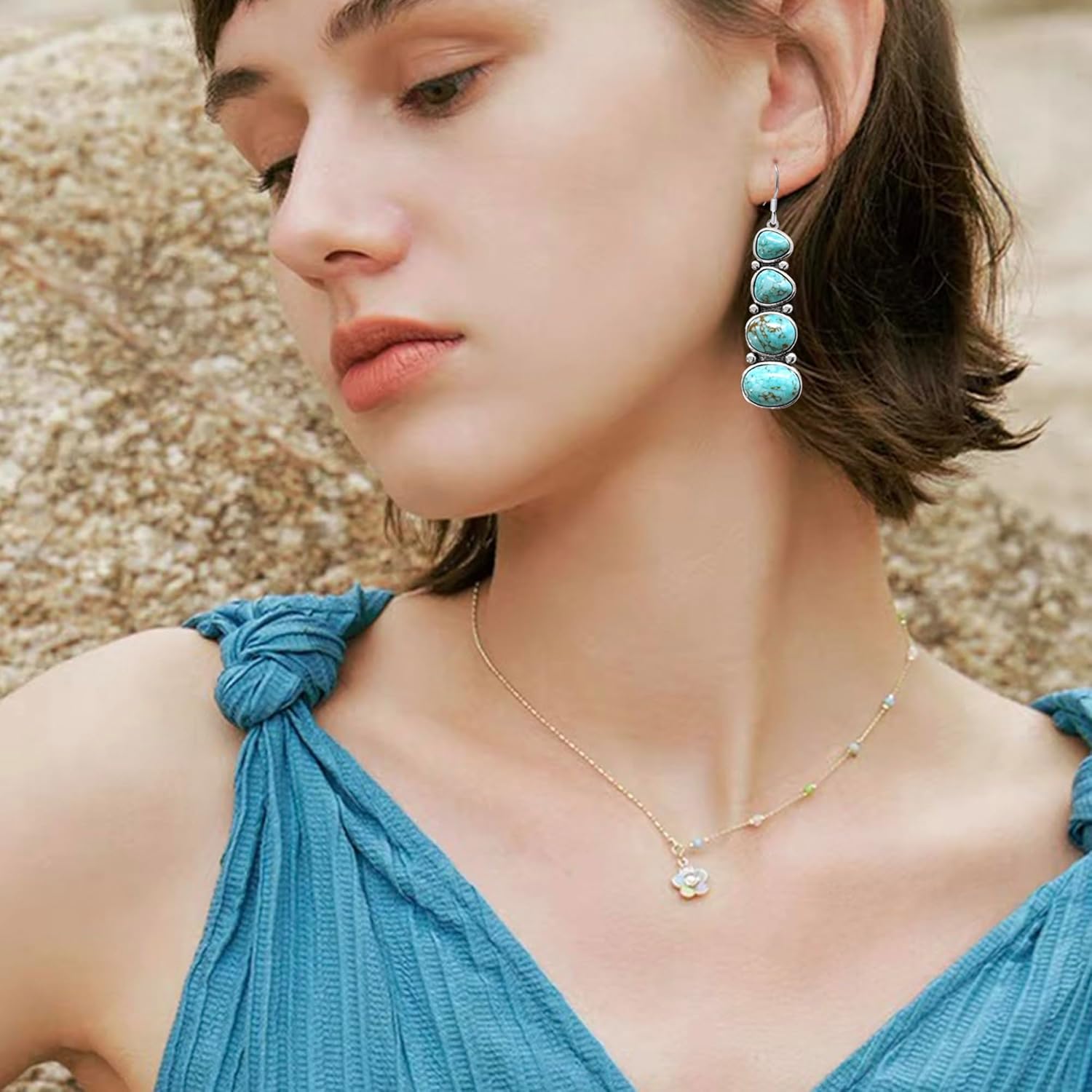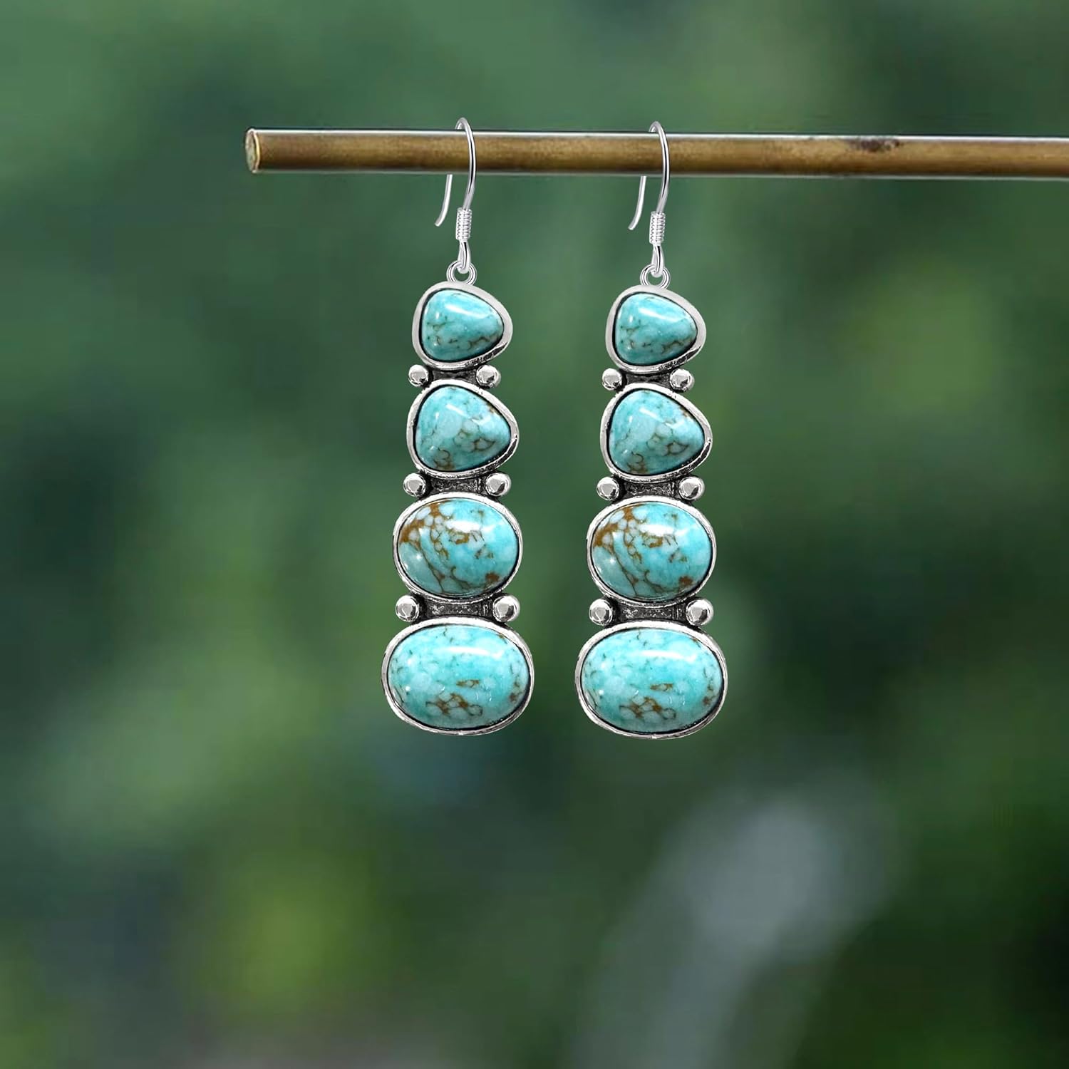 GPASTG Bohemian Handmade Vintage Silver Turquoise Stone Long Oval Geometry Dangle Drop Earrings For Women