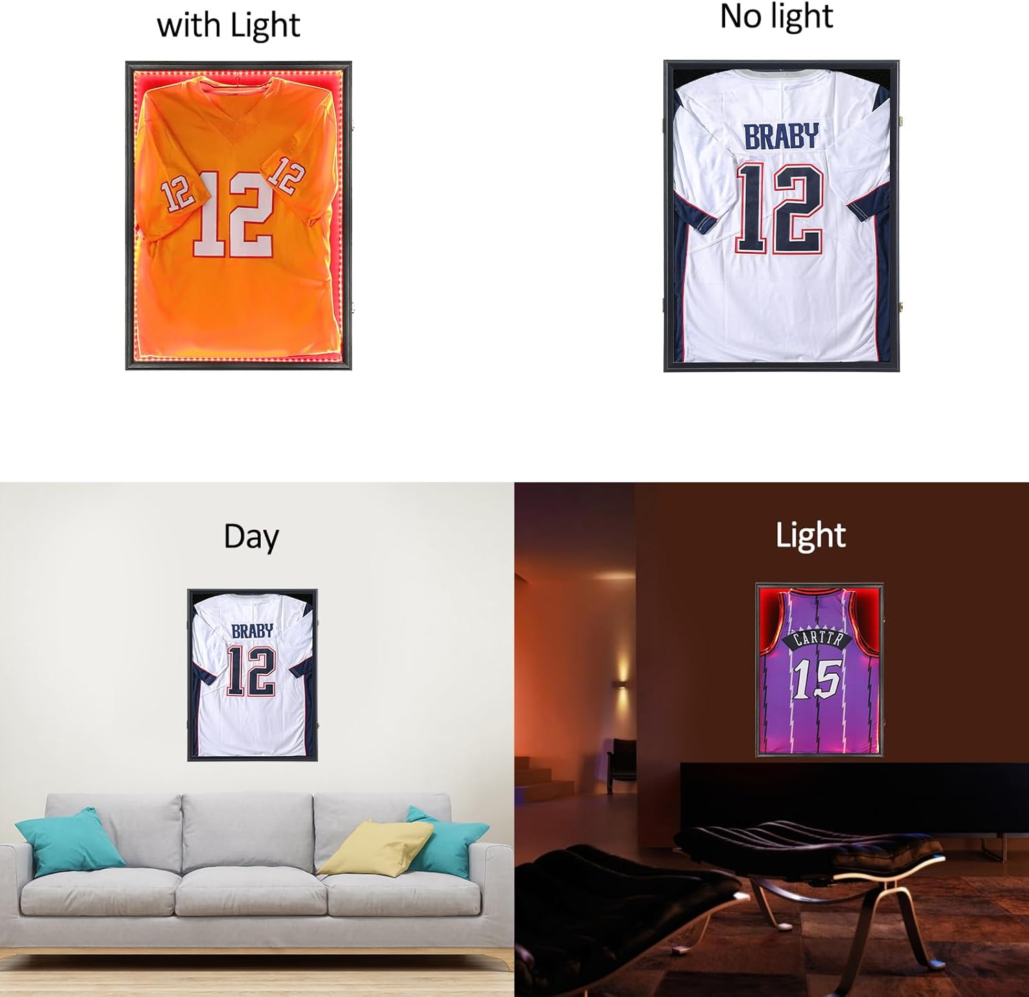 LED Jersey Case – The frame with LED lights illuminates jerseys in the dark, making them more visible. It is a great gift for sports fans! Measuring 31.25″ x 23.25″ x 1.5″, this large display frame fits most sports jerseys such as baseball, basketball, football, soccer, and hockey, and can also be used as a shadow box to display military uniforms, graduation memorabilia, and other cherished memories.