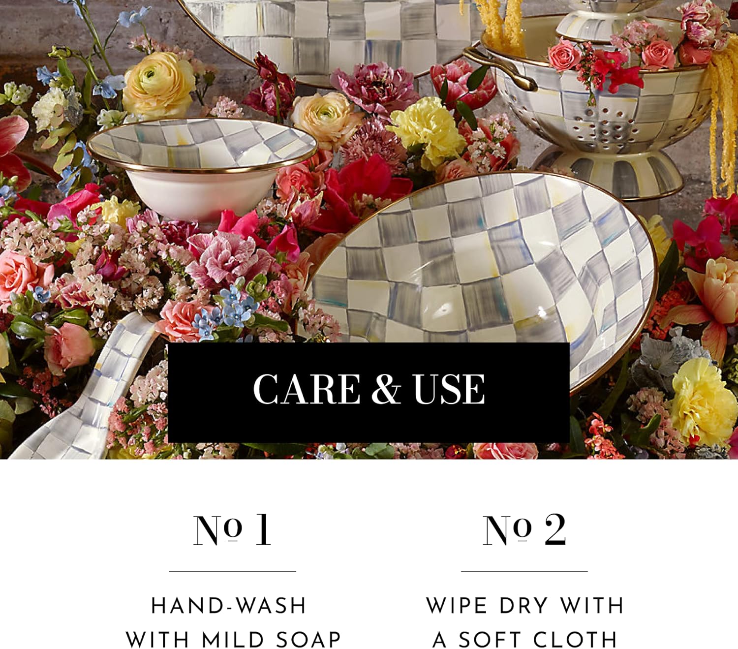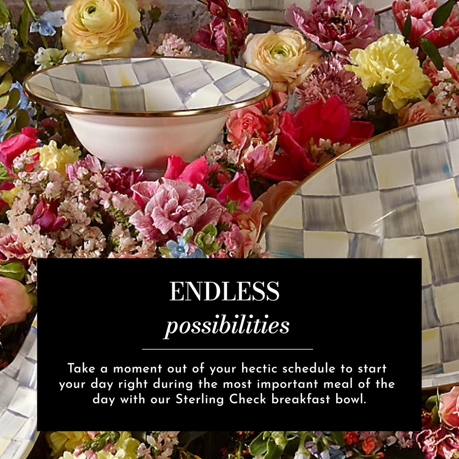 ELEGANT SERVING ESSENTIAL: Start your day with our Sterling Check Enamel Breakfast Bowl. The heavy-gauge steel underbody features hand-painted color-dragged gray-and-white checks and is rimmed in bronzed stainless steel.