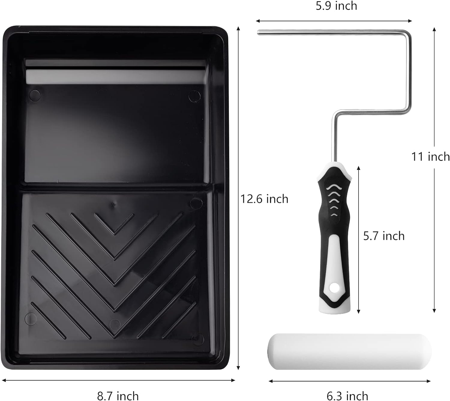 What you get: This 6 inch paint roller set includes high density foam paint roller cover 6 inch, textured paint tray 6 inch, disposable paint tray liner 6 inch, paint roller frame