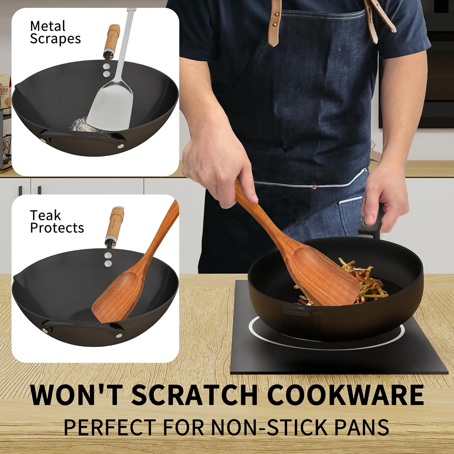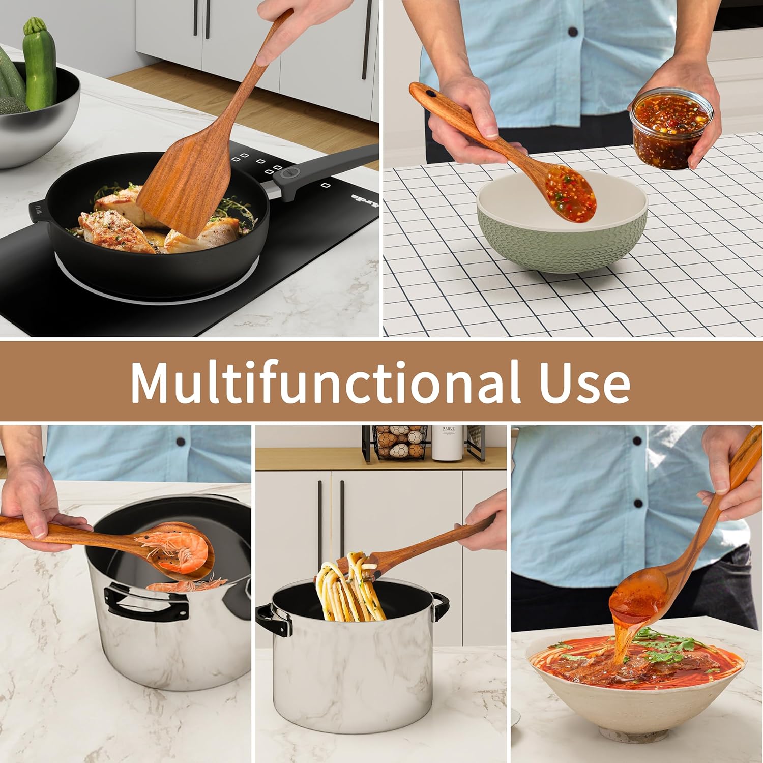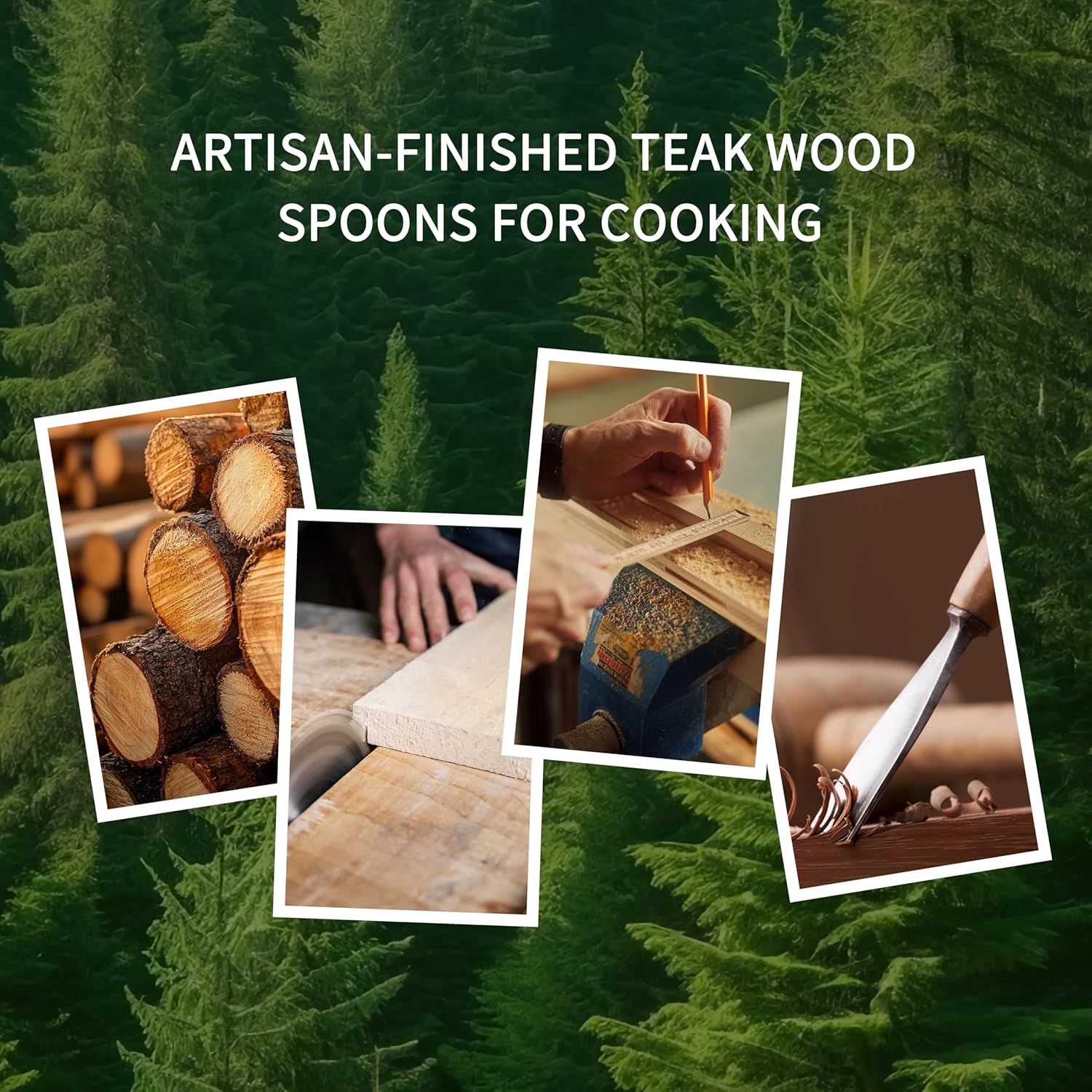 100% Natural Teak Wood & Superior Durability: Crafted from solid, food-grade teak wood for unmatched hardness and moisture resistance. Denser than bamboo or silicone, these utensils resist cracking, warping – ensuring lifelong kitchen companions