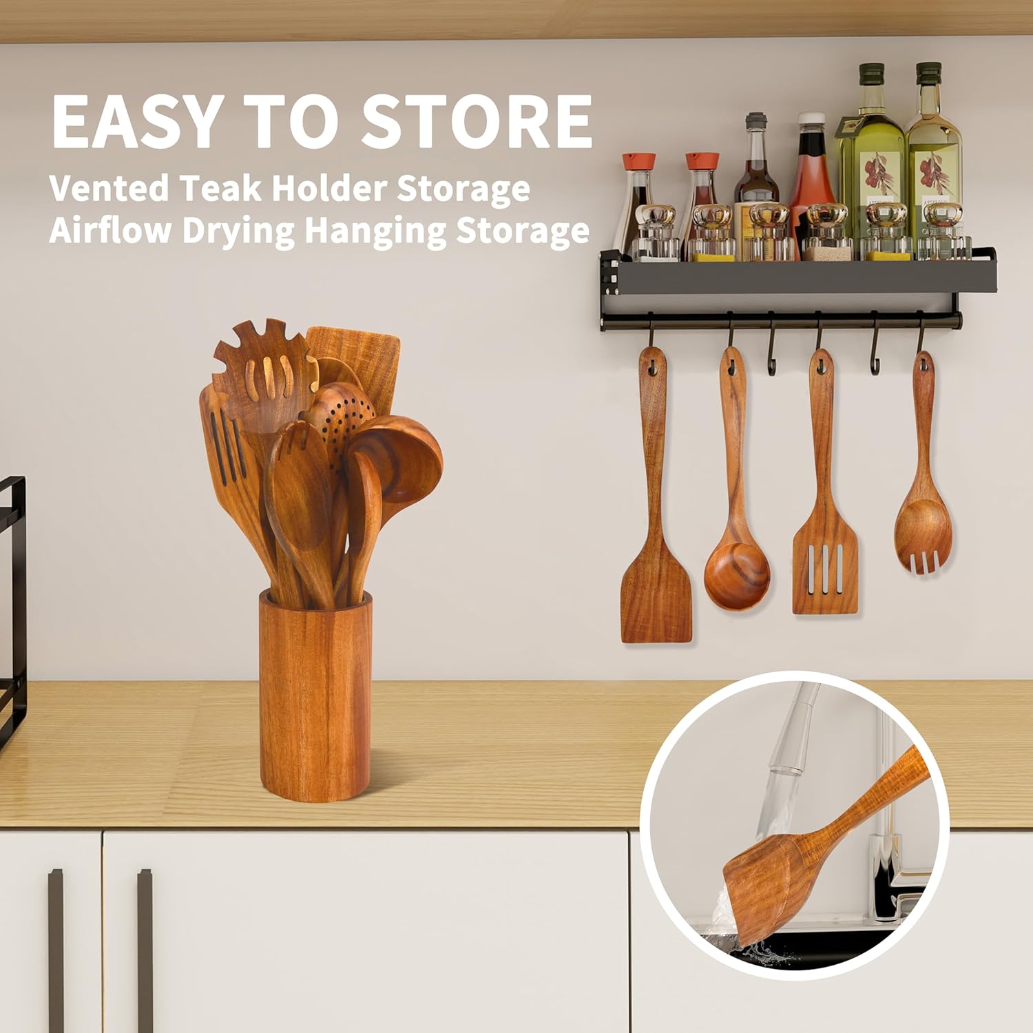Complete Kitchen Solution with Easy Storage: 10-Pcs set includes Wok Turner, Frying Spatula, Soup Ladle, Salad Fork, Slotted Turner, Strainer Spoon, Pasta Spoon, Mixing Spoon, Seasoning Spoon, and Utensil Holder. Each tool features a hanging hole for drip-drying or wall storage, paired with a chic teak holder for countertop organization