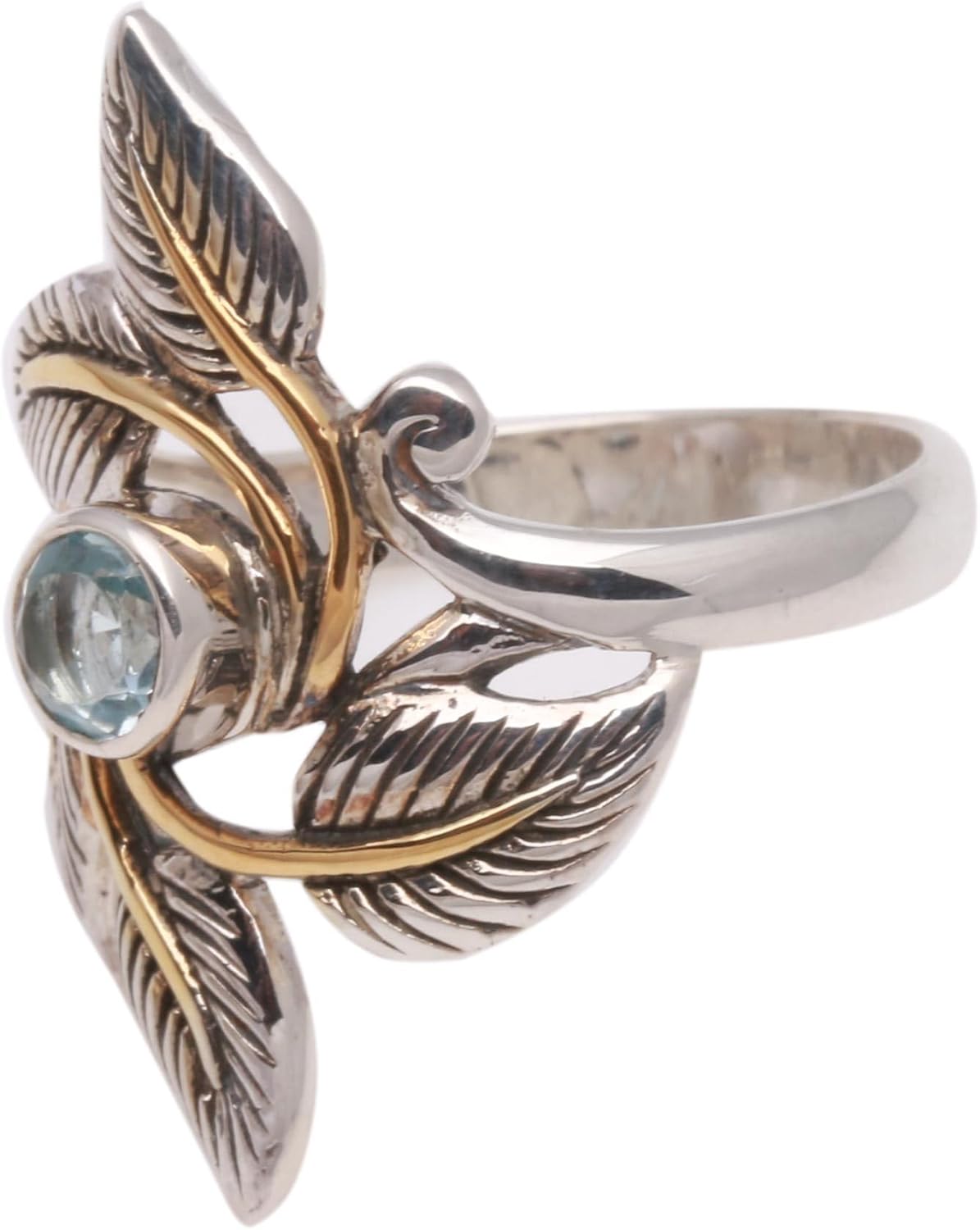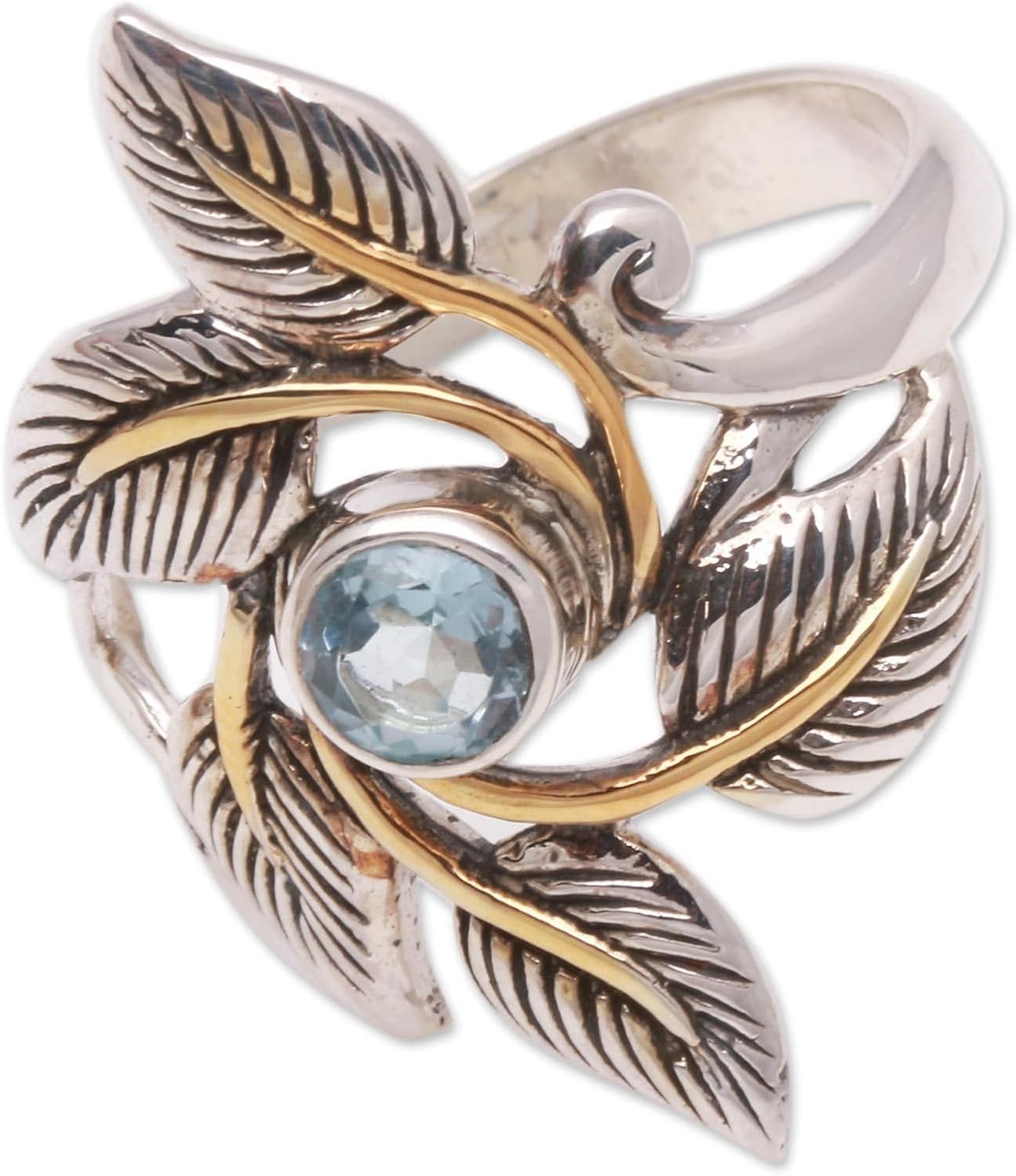NOVICA Artisan Handmade 18k Gold Accented Blue Topaz Cocktail Ring Leafy from Bali .925 Sterling Silver Indonesia Gemstone ‘Wreathed in Leaves’