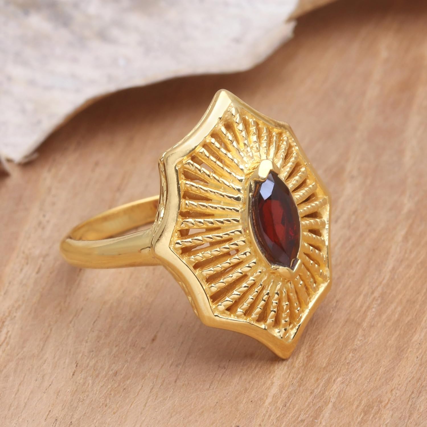 About this item: Suggestive of a spider’s web, this lovely cocktail ring is the original creation of Giri Tasmana in Bali. The 18k gold-plated sterling silver ring is set with a crimson marquise-cut garnet….