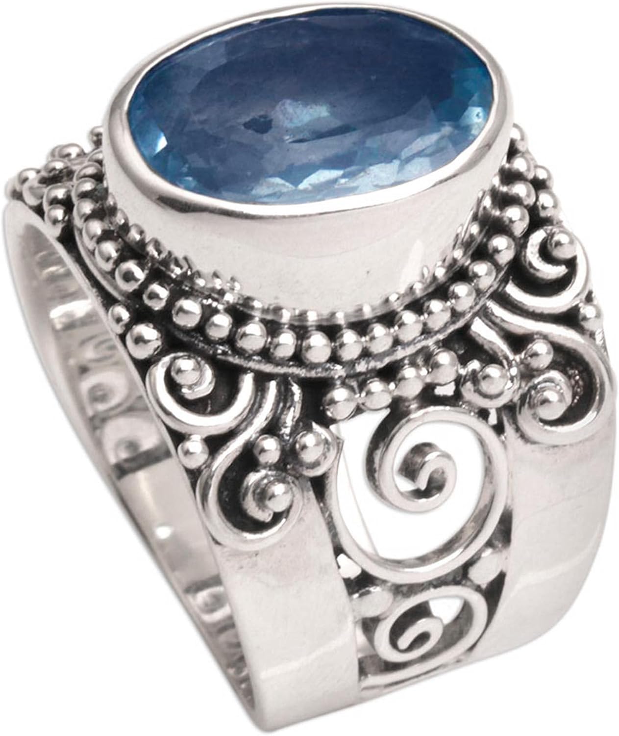 Crowned by a six-carat oval of blue topaz, this glorious single stone ring from Bali is designed by Buana. He works with local artisans to handcraft the band or sterling silver, elaborating it with bubble designs around the bezel and openwork vine motifs along the band. Intricate design and brilliance of gemstones bring out the glamour and adds to its luxurious look.