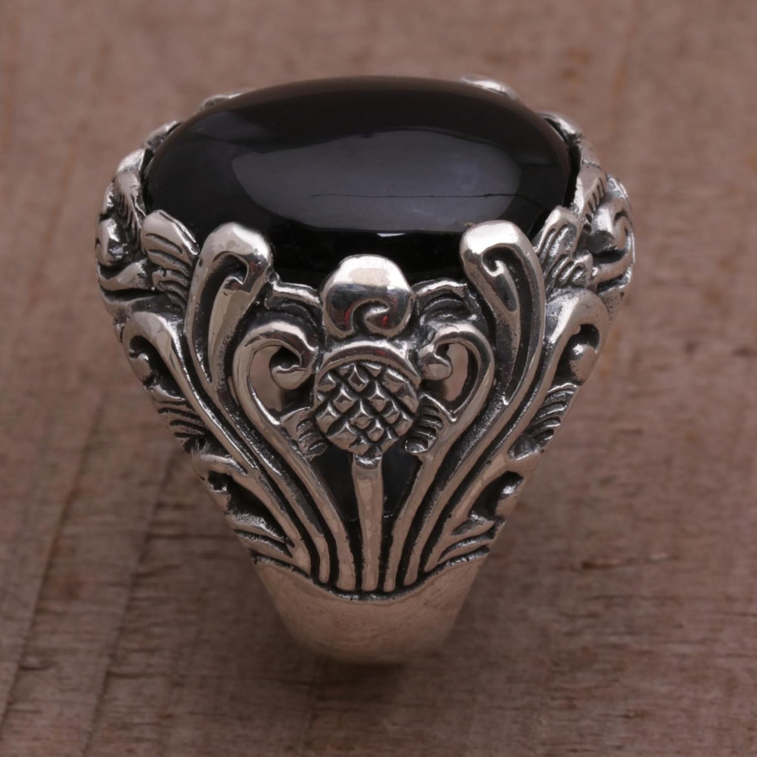 NOVICA Handmade Floral Sterling Silver Onyx Cocktail Ring