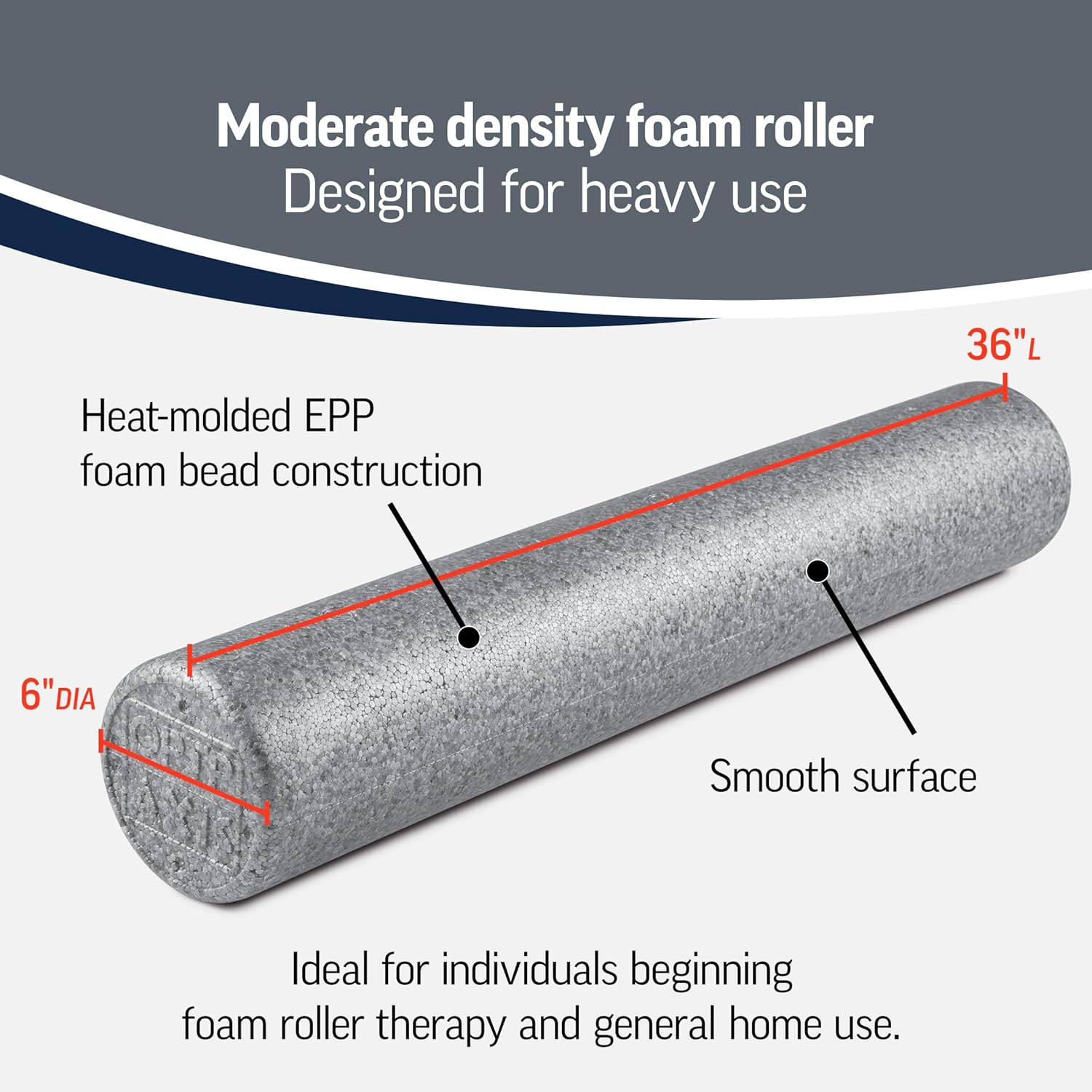 Foam Roller 36 In Measurements: 36” long x 6” diameter; Round. Perfect for rolling out larger areas including hamstrings, quads and the back.