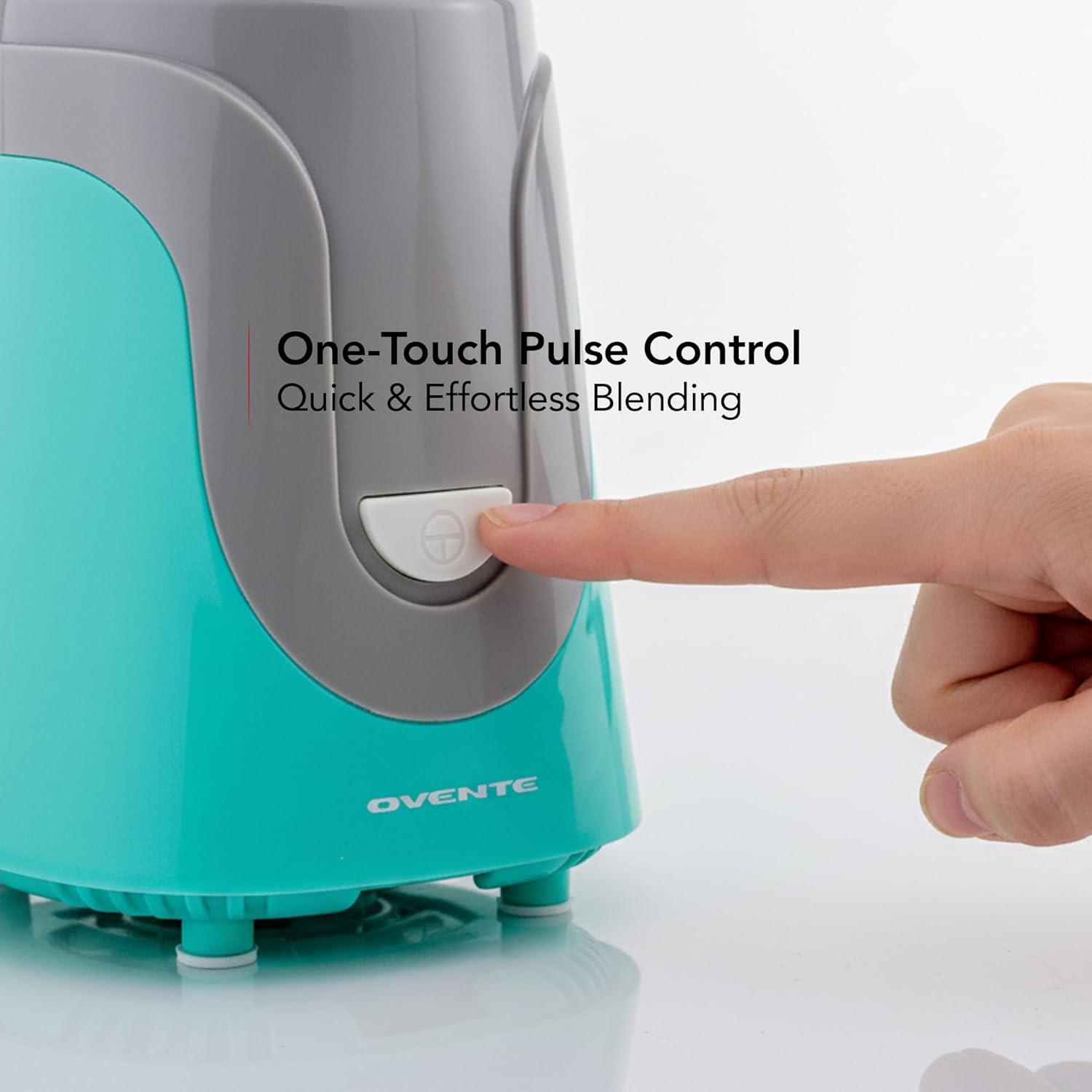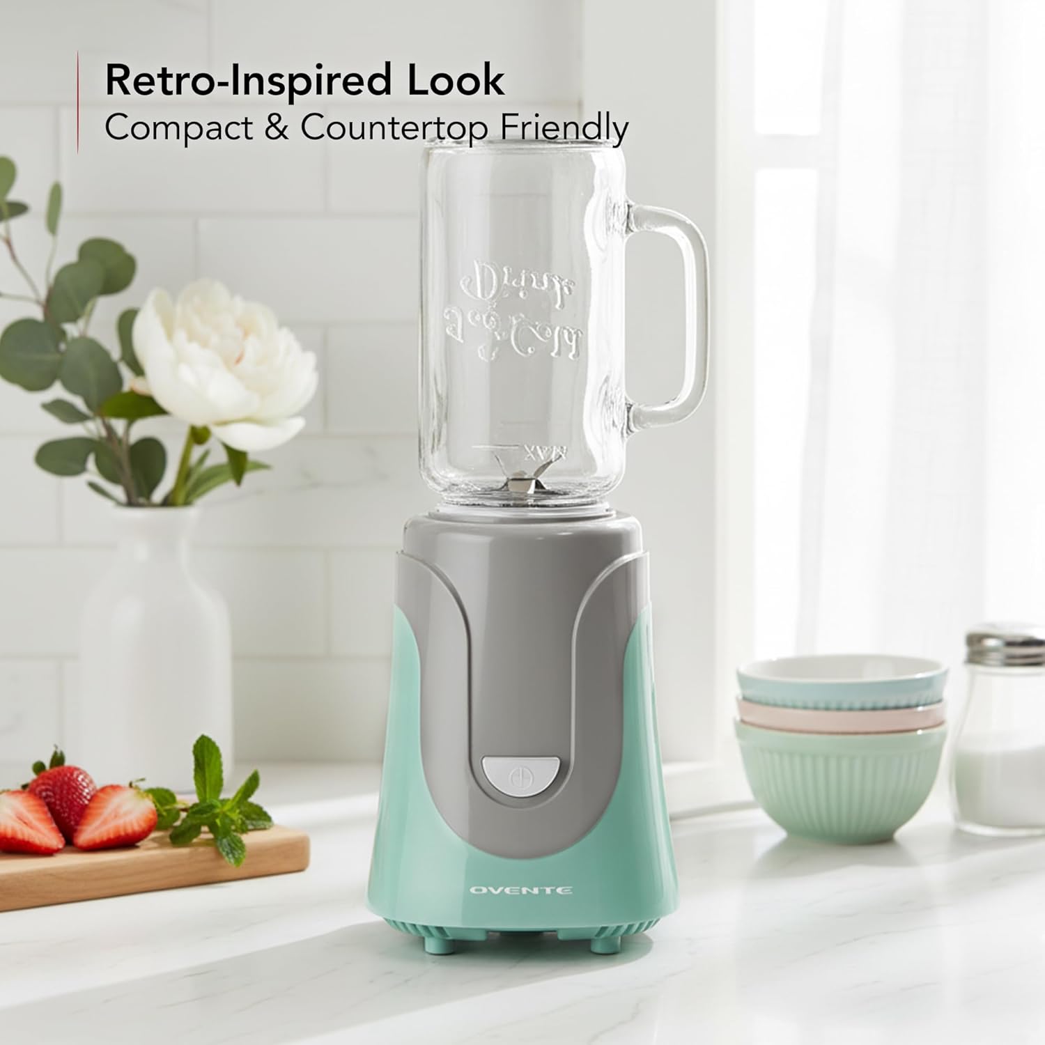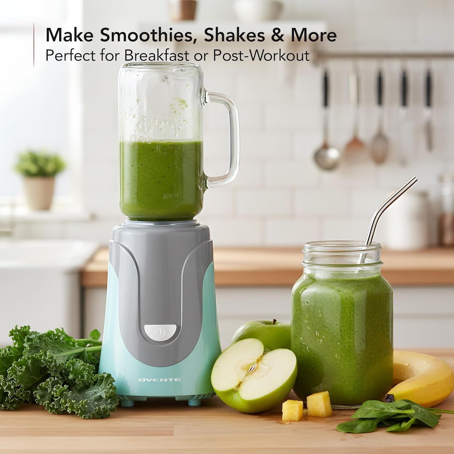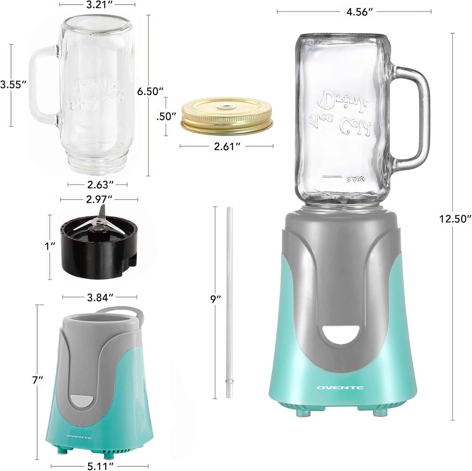 Enjoy your favorite shakes, fruit smoothies, or power-packed protein drinks with the OVENTE Retro Personal Blender BLH1002T, you can easily prepare and enjoy shakes, smoothies and protein drinks. This blender comes with an 18 oz glass mason jar with a metallic lid, allowing you to enjoy your creations on the go. Simply remove the BPA-free blender jug from the base and take it with you wherever you need. Equipped with a 300W motor, this compact blender is easy to store. The handy pulse button lets you control the blending process with ease. With simple one-touch operation, blending becomes quick and effortless. Plus, the reusable, dishwasher-safe blending cups make cleanup a breeze. Designed for single servings, this personal-size blender ensures you don’t have to store leftovers in the freezer, preserving that perfect smooth texture. Make this blender part of your daily routine for a fast, simple, and refreshing way to get your daily nutrients. NOTE: To prevent overheating, limit continuous operation or pressing the pulse button for more than a minute. To break up ingredients more easily, pulse in short bursts a few times at the beginning of your blend.