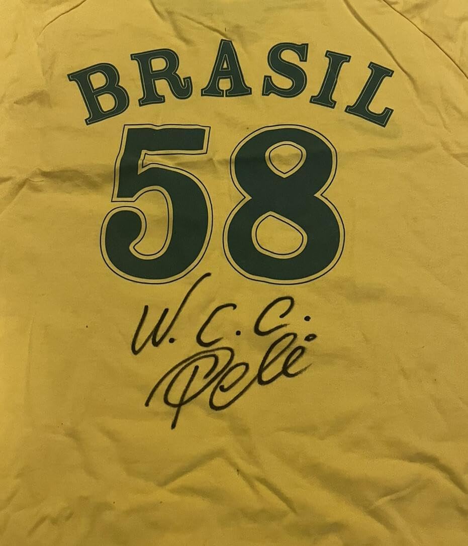 PELE SIGNED 1958 BRAZIL JERSEY PSA/DNA NATIONAL TEAM JERSEY INSCRIBED . If a product is unsigned or non game-used, a hologram will not be included. Pele memorabilia. Brazil National Team memorabilia.