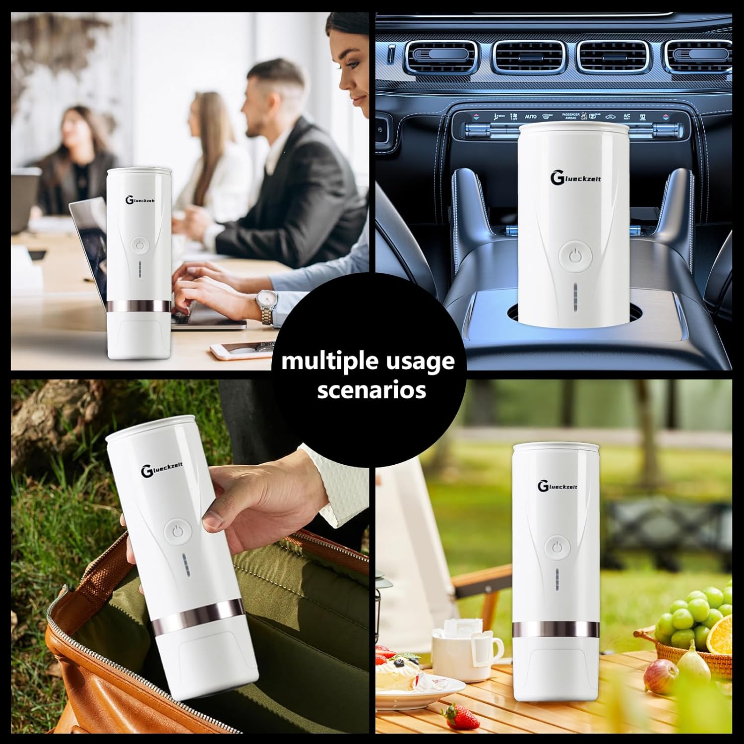 Portable Electric Espresso Machine, Car Travel Self-Heating Electric Coffee Maker for Camping with Type-C, Suitable for ground coffee and Ns capsules for RV, Hiking, Office Spring Travel White Heating